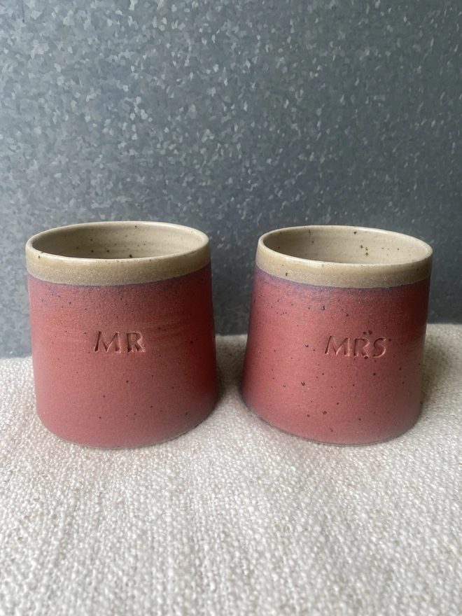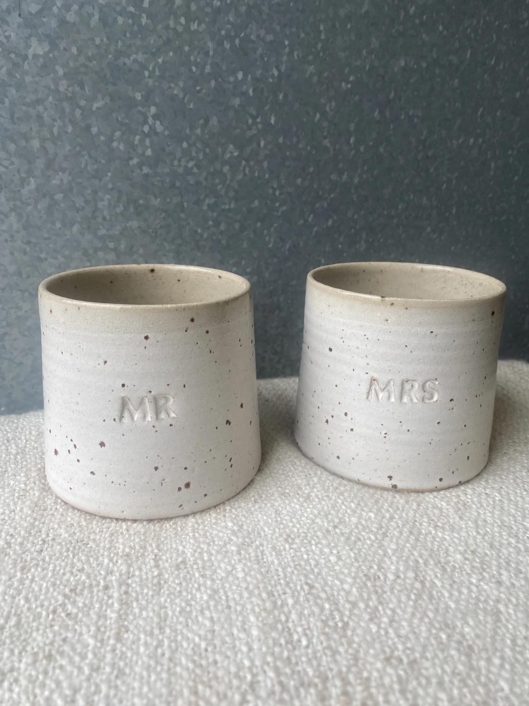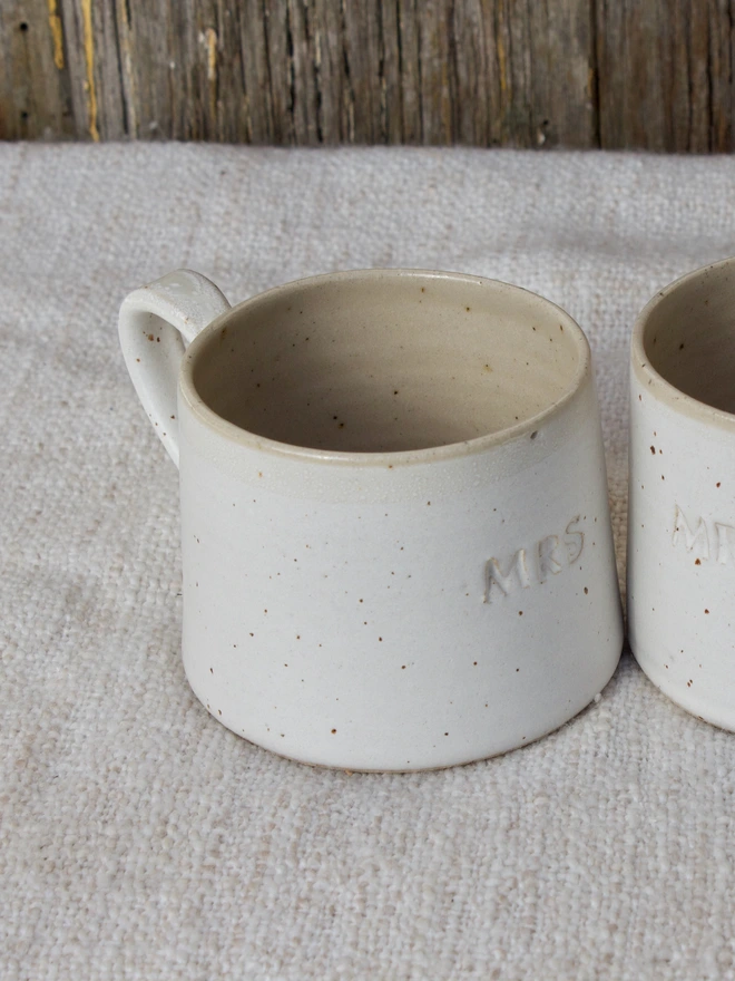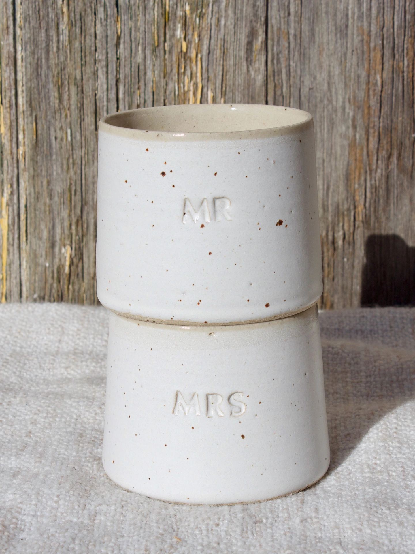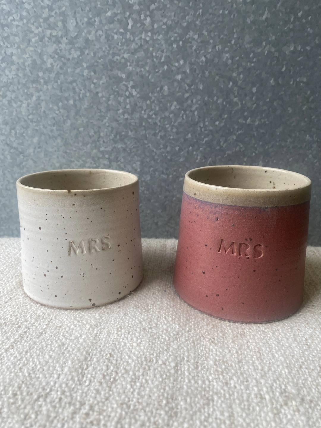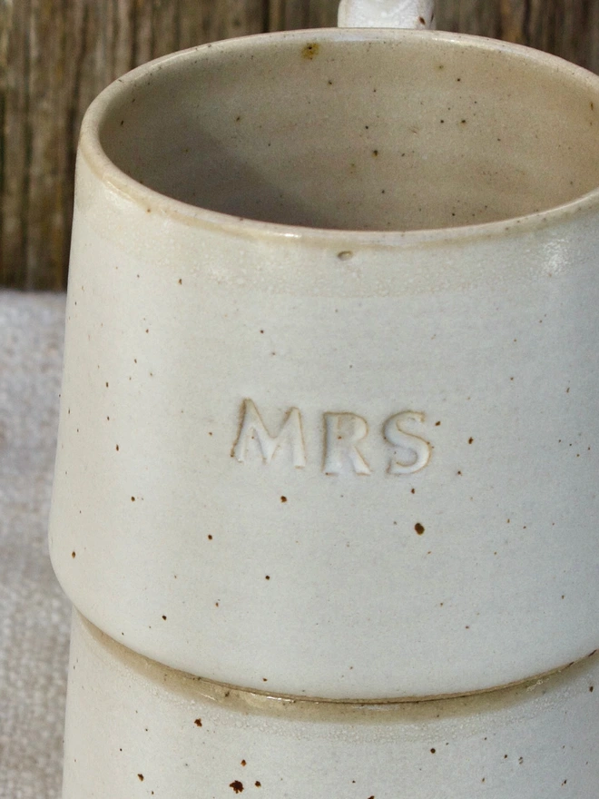 Beautiful hand-thrown mug with 'MRS' hand stamped on it.