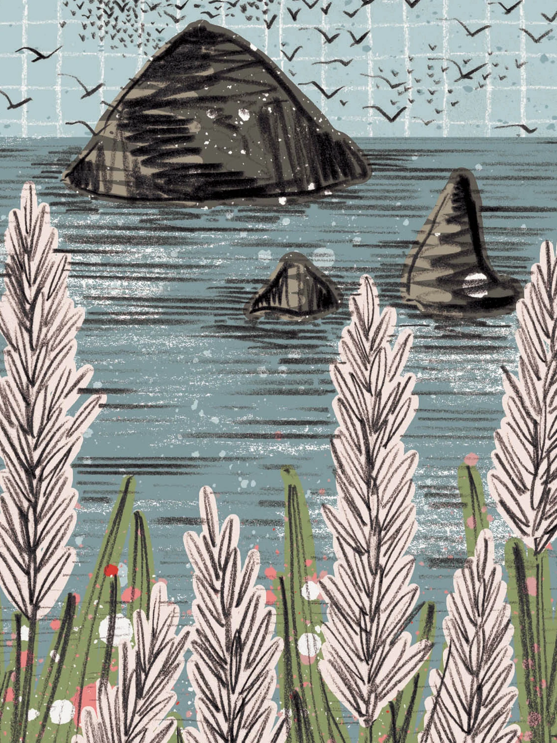 A swirling murmuration of birds flocking over the sea. Originally hand drawn in pencil, coloured digitally and printed on the most luxurious Italian paper.