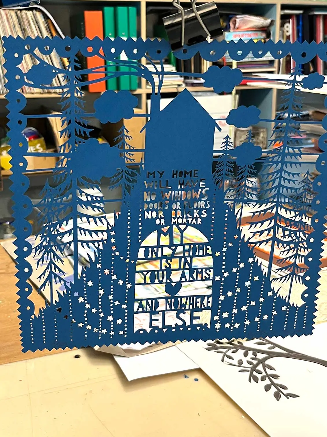 'My Home' blue lasercut presented in a china white folder.