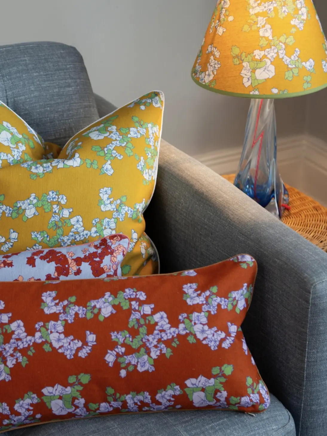 Our collection Najjar is inspired by Bougainvillea which thrives so well and blooms so abundantly in the hot climate of West Africa. Najjar homewares and fabric are printed on Wexford Linen and available in four luscious tones of Coral Orange, Steel Blue, Saffron Yellow and Oyster White.