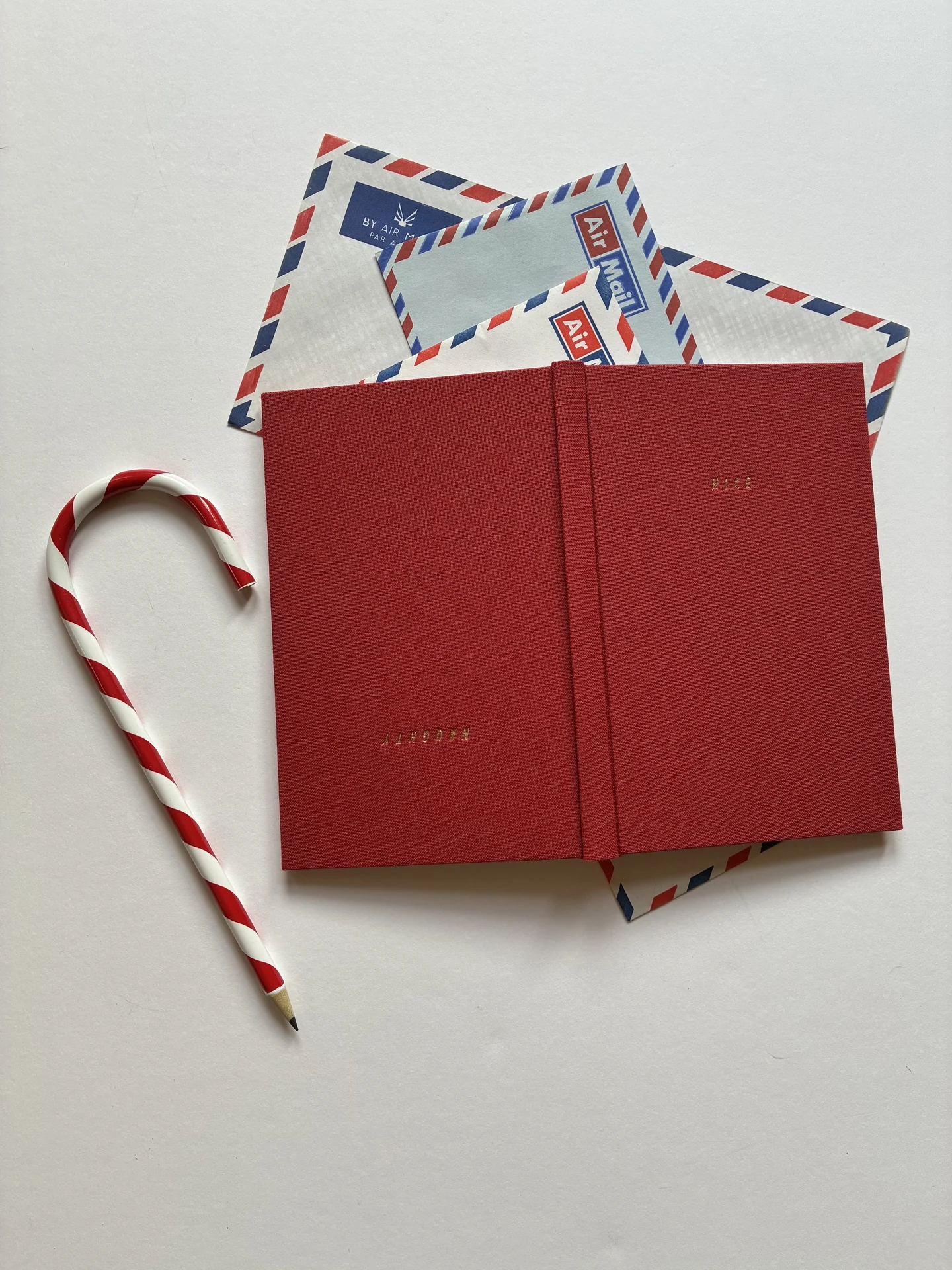 Covered in a beautiful, festively red linen cloth and adorned with hot foiled gold lettering.