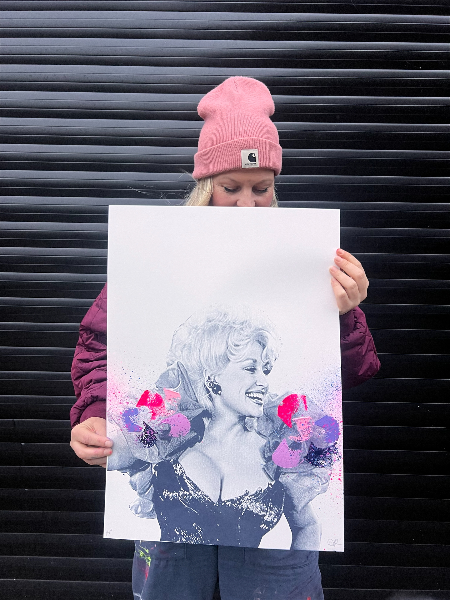 Fuschia Dolly Parton inspired screenprint, with hand finished swooshes, Unframed screenprint. Delivered rolled. A2, edition of 40 on Bockingford 300gsm.