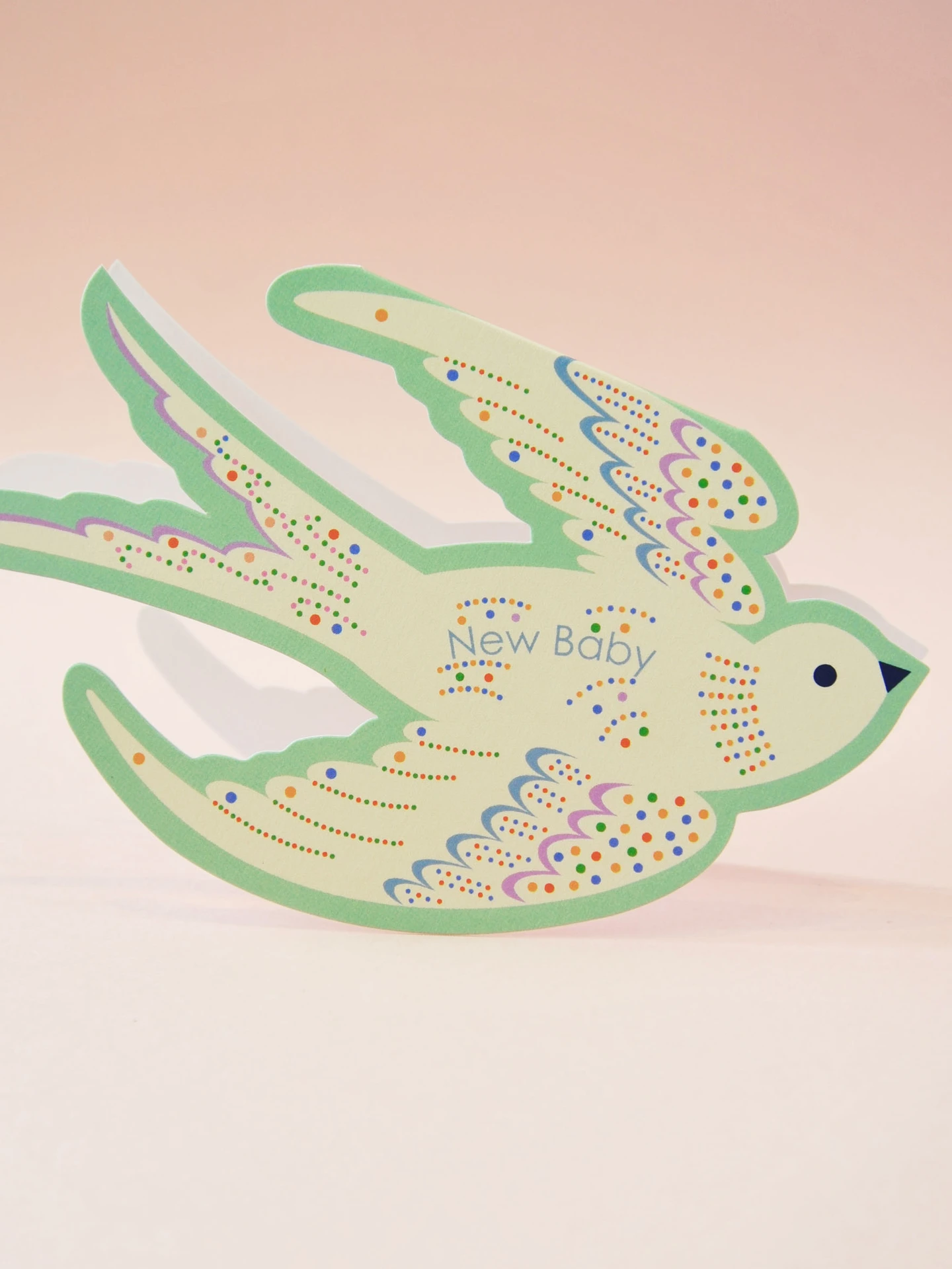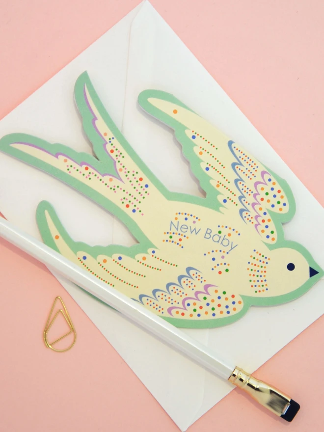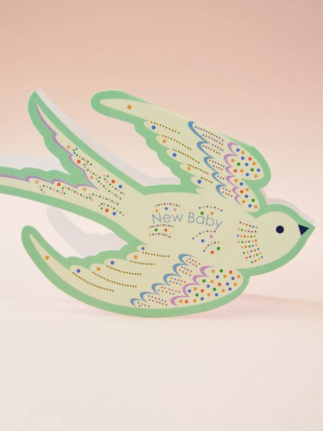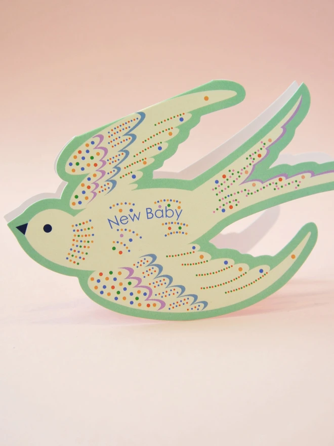 Celebrate a new arrival with this enchanting die-cut baby card featuring a gentle rocking bird design. Printed in soft mint green and sprinkled with cheerful multicoloured dots, it’s a joyful way to welcome a little one into the world.