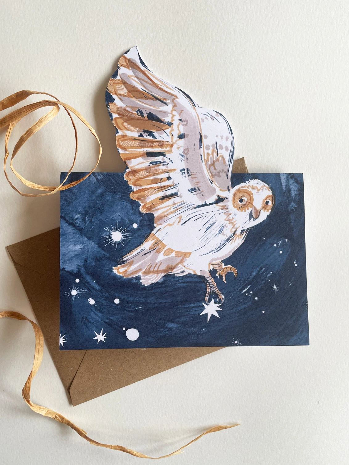This hand-cut card is designed to adorn a mantelpiece or shelf long after the message you send has been read and enjoyed. My mixed media and digital illustration shows a friendly feathered owl flying through an inky night sky. The owl's wing unfolds to make for an extra special greetings card that brings a sense of movement and fun to any occasion.