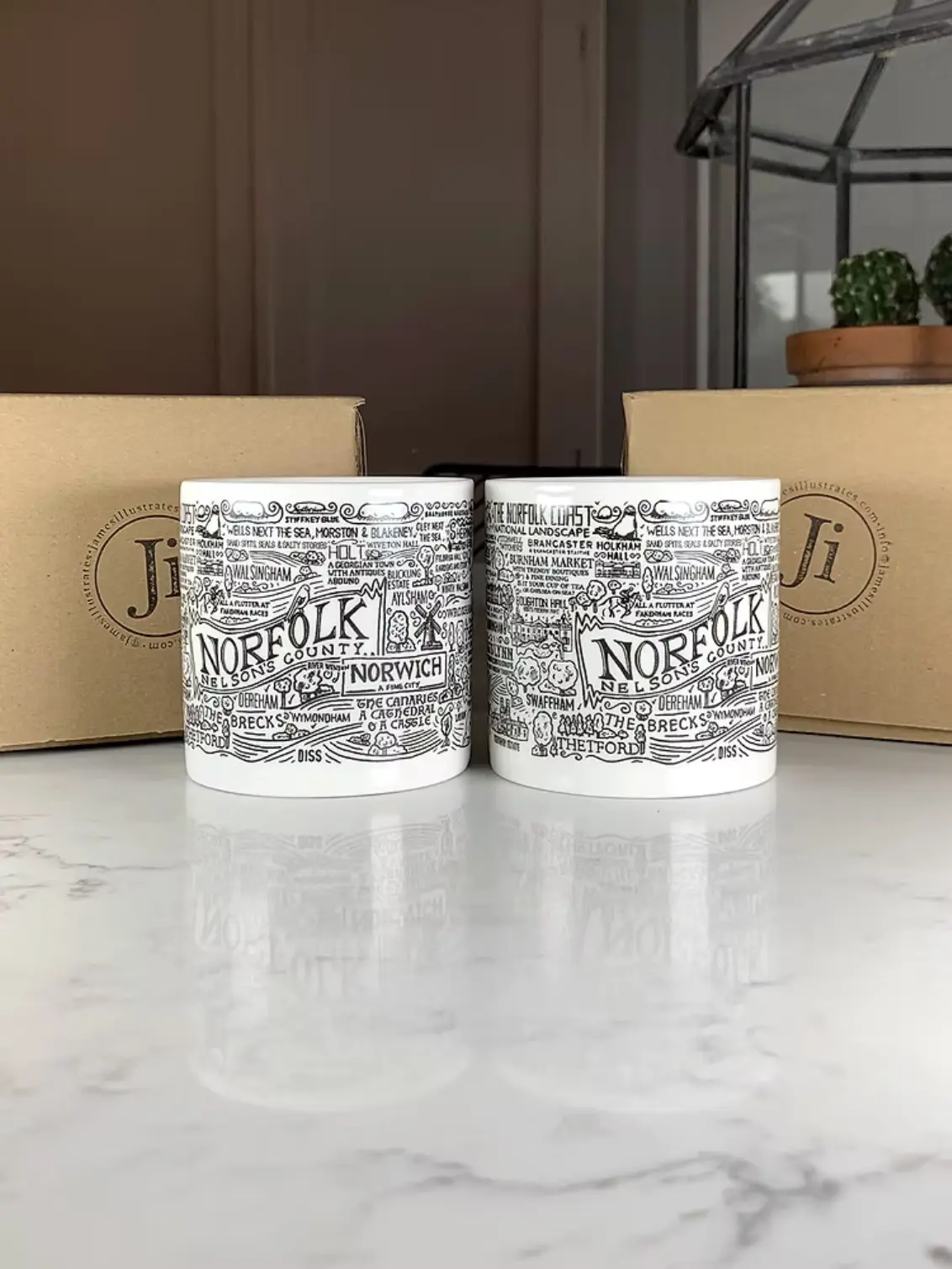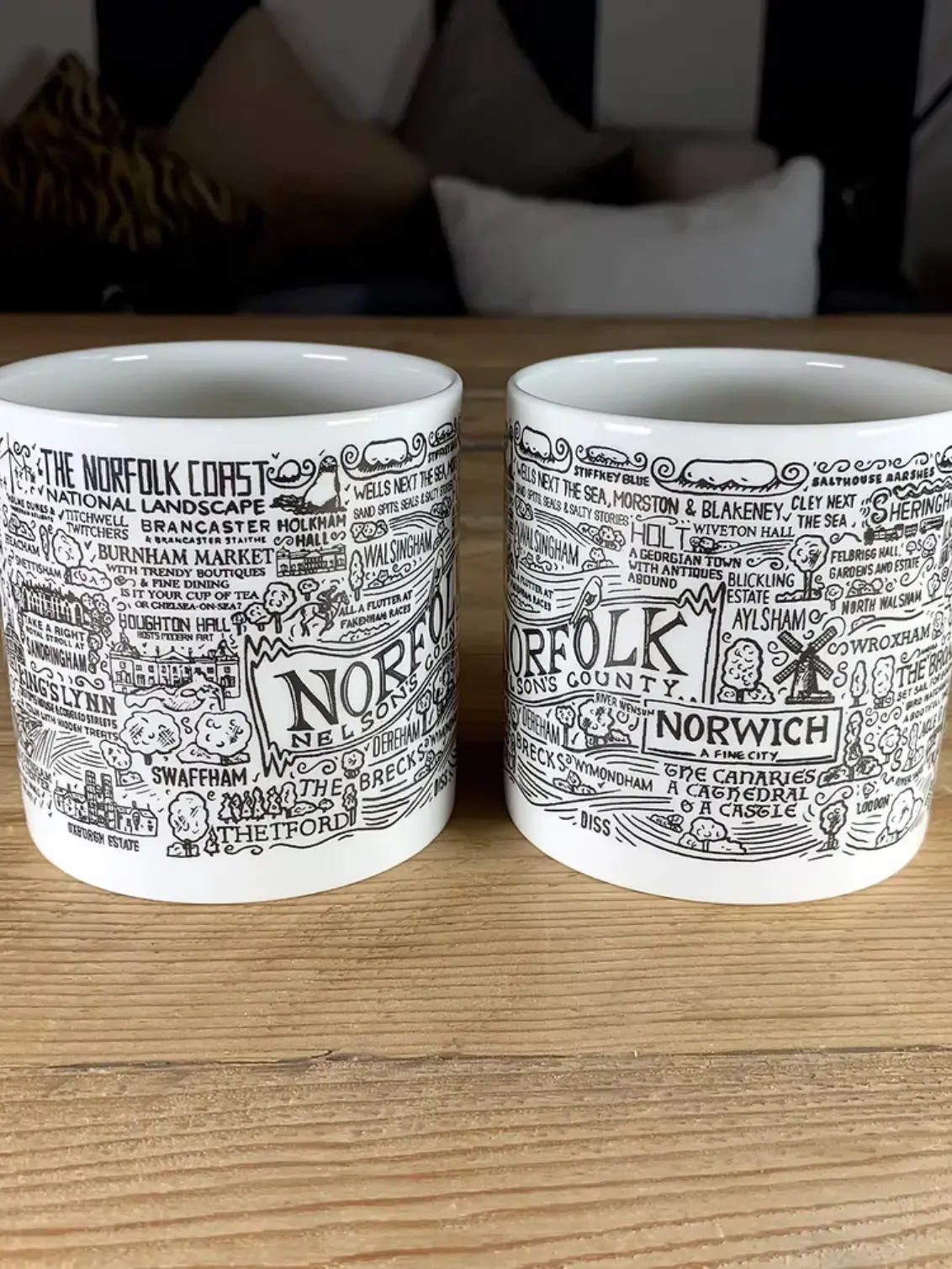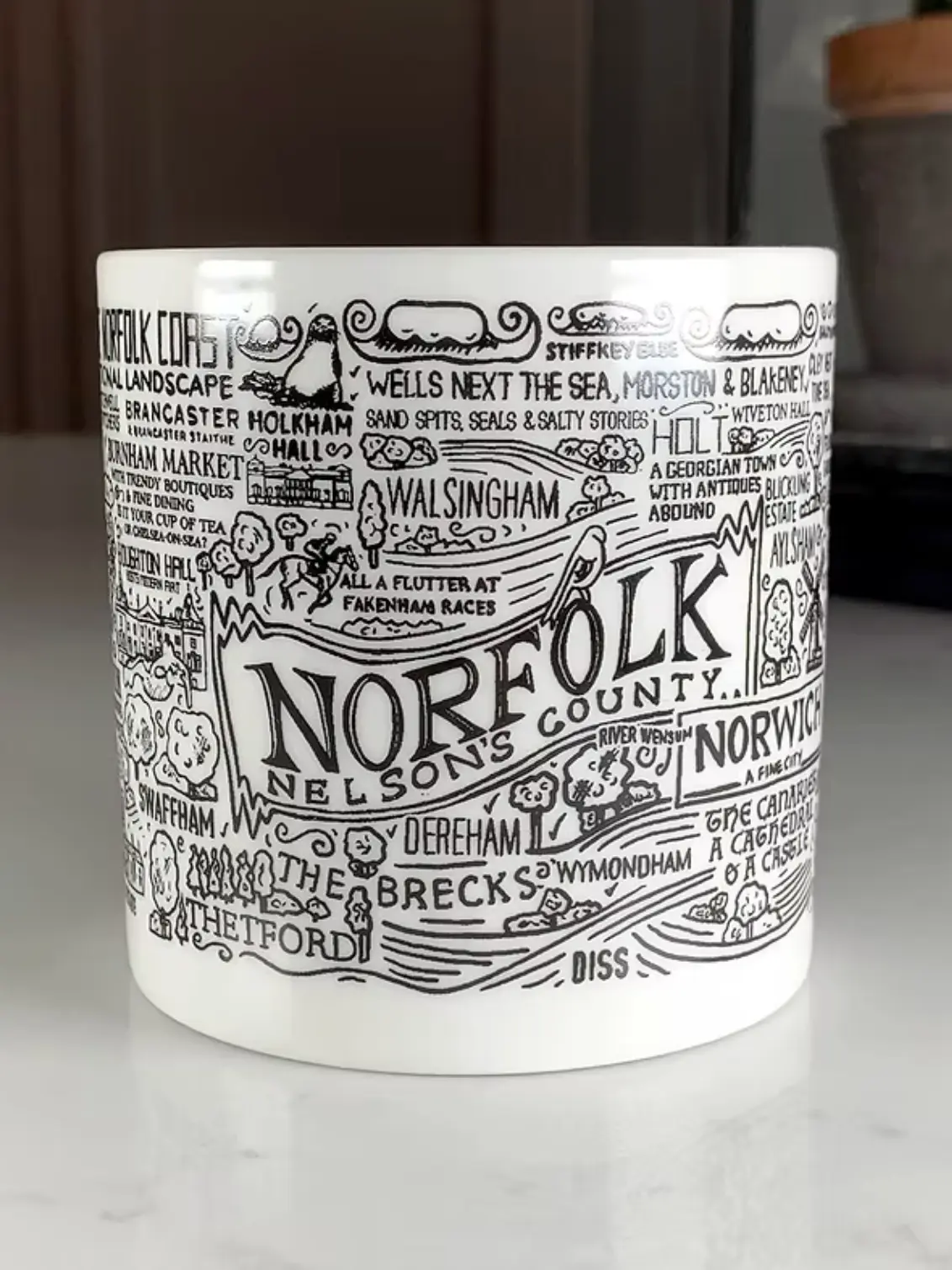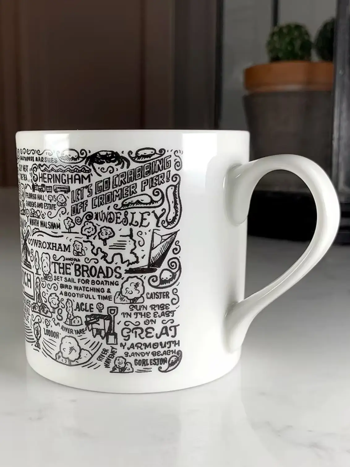 From Norwich to Kings Lynn, Great Yarmouth to the North Norfolk coast, it's all covered. This updated illustration has so much more and is especially drawn for this mug.