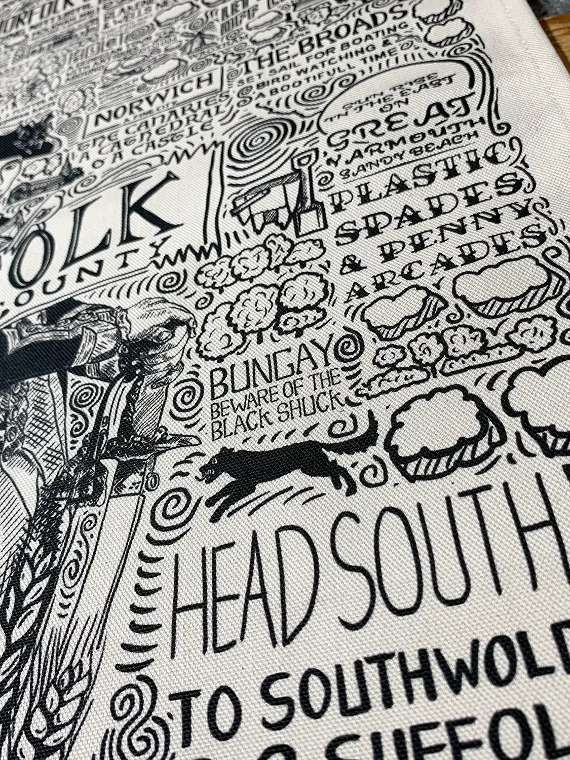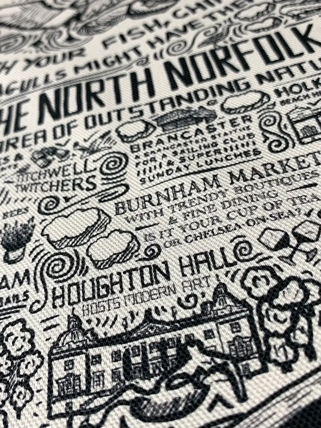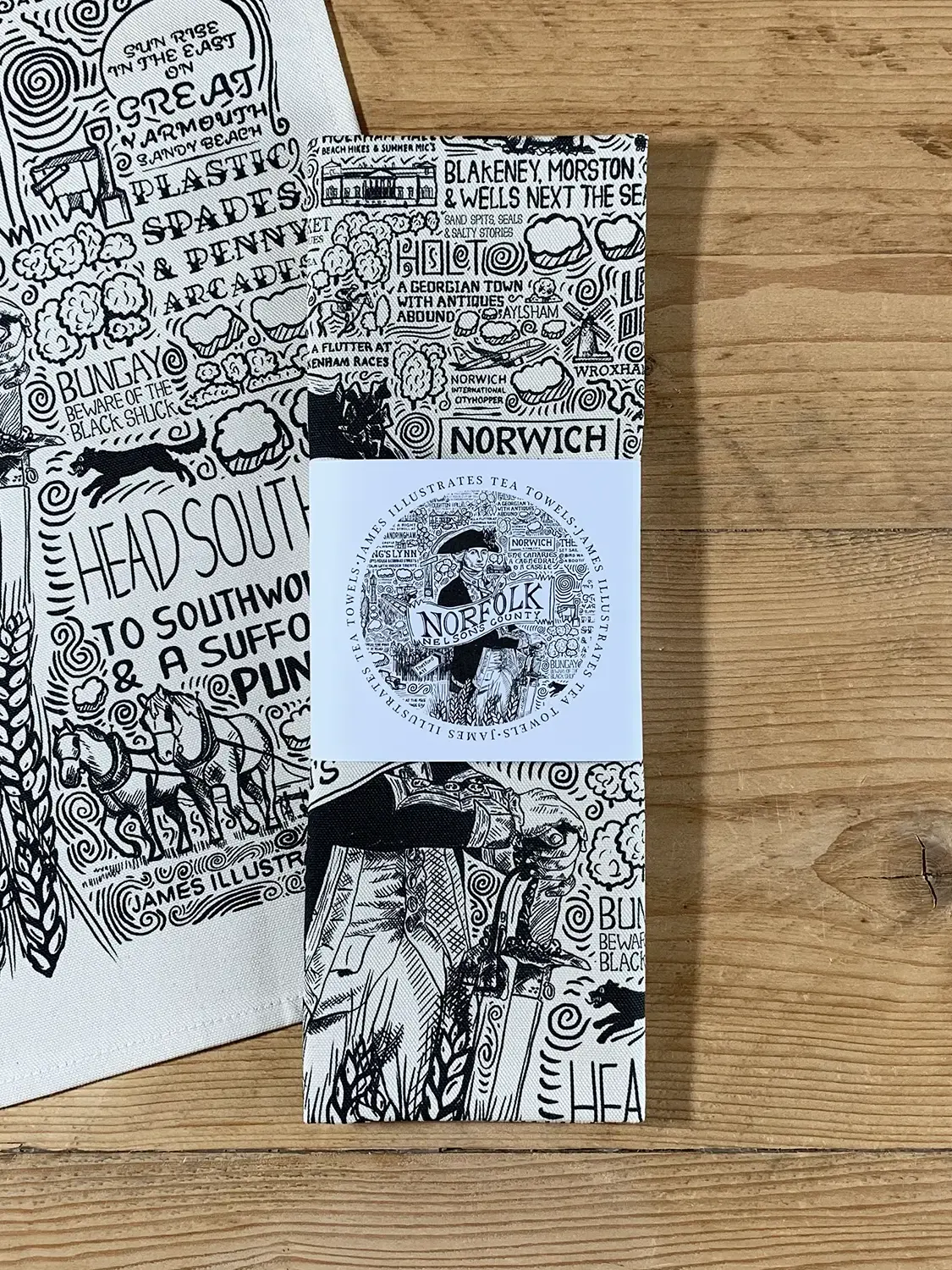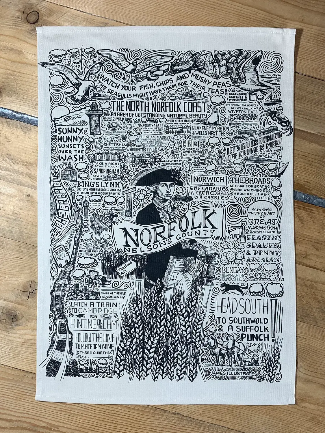 The Norfolk illustration featured on the tea towel has been researched and illustrated by me, James, and is packed full of interesting and quirky facts and sayings. It will keep you coming back to discover more!
