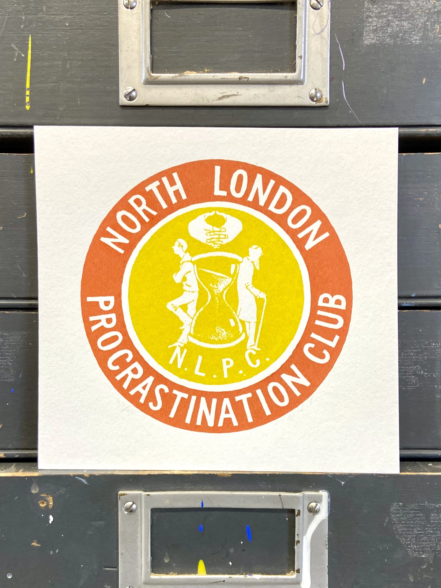 Limited edition of 50 per colour yellow 'North London Procrastination Club' Screen Prints with outer ring in blue, red, or green.