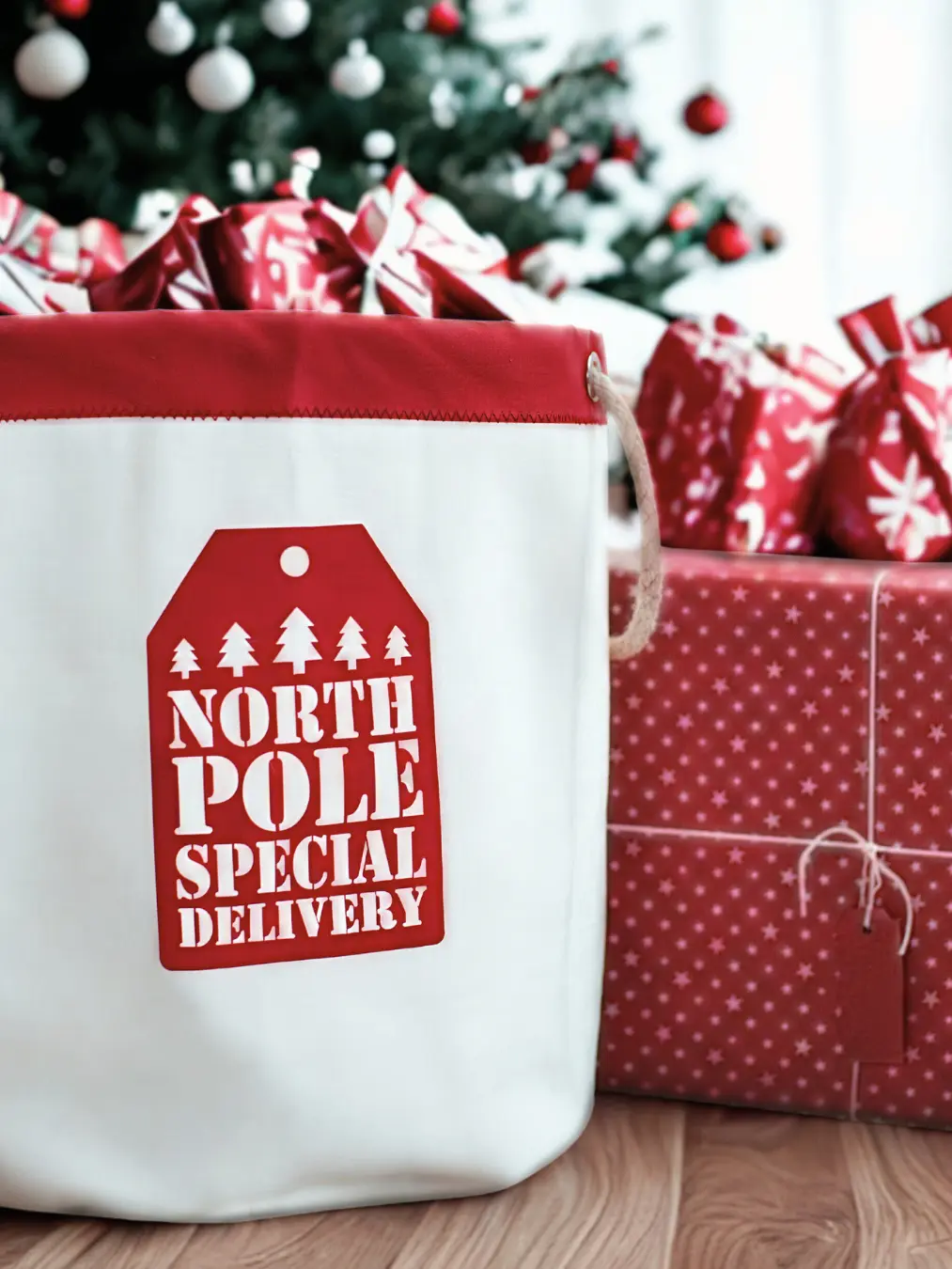 Handmade from white recycled sails with a jolly red trim, rope handles knotted through nautical grommets and a "North Pole Special Delivery" label laser cut from red insignia sailcloth.