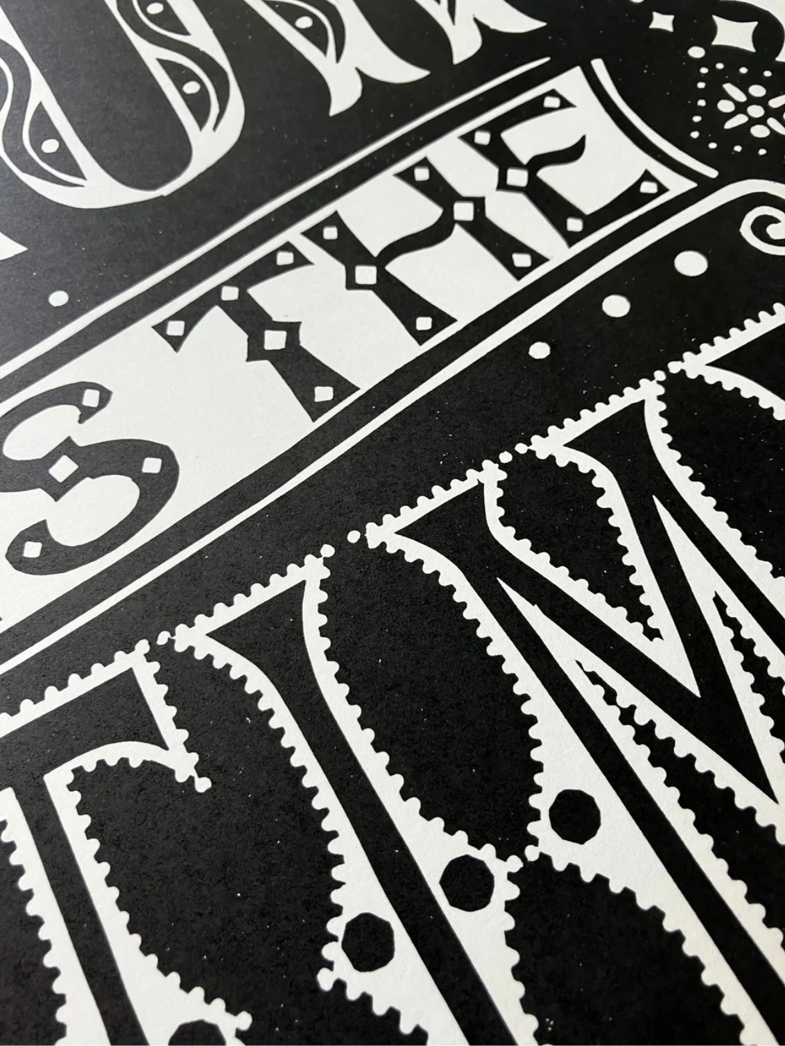 Hand-carved and traditionally printed, this typographic linocut features expressive, decorative lettering inspired by vintage signage and folk design. The artwork blends strong messaging with hand-rendered beauty, creating a piece that is both motivational and visually striking.
