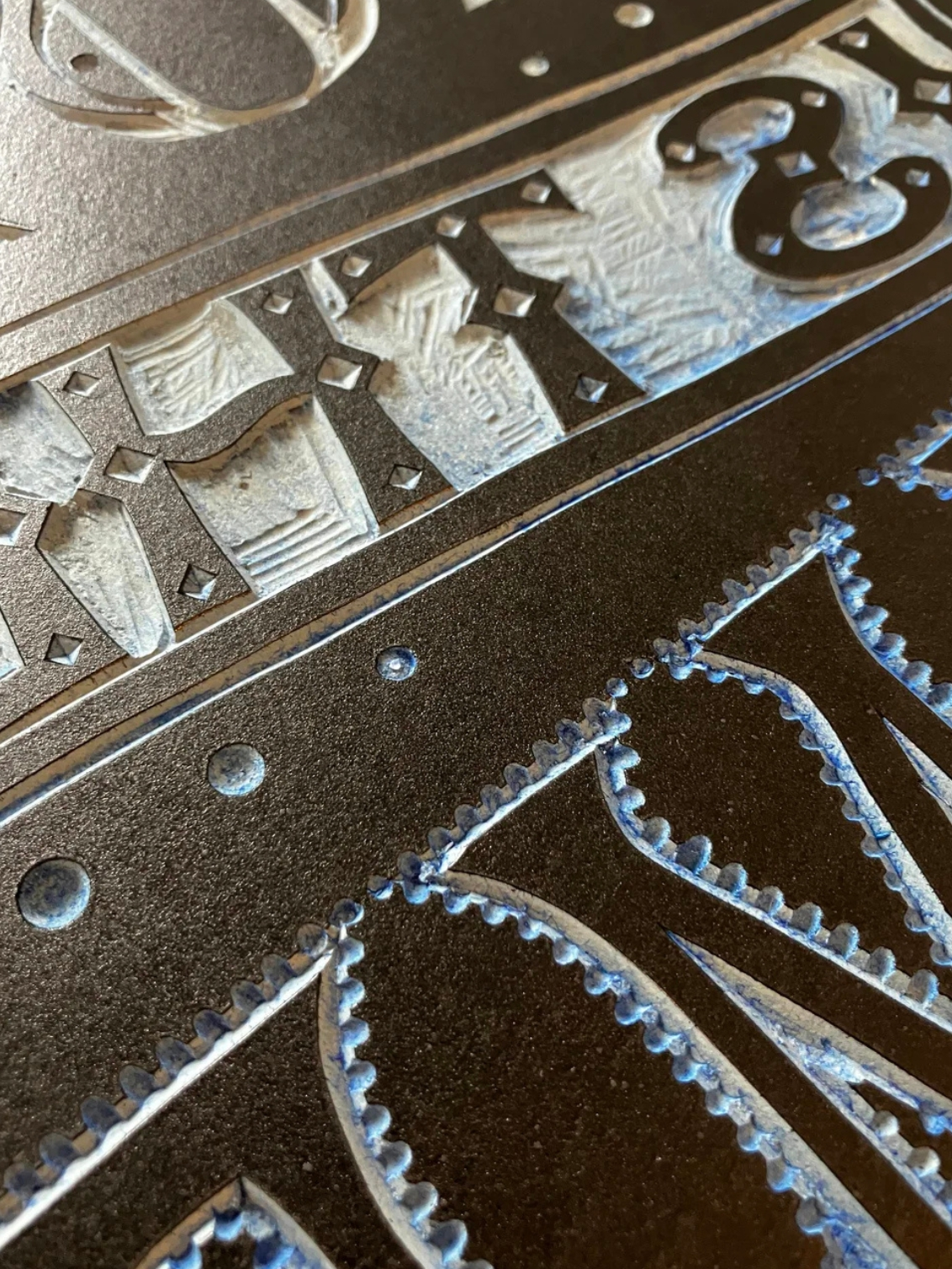 The relief block has been carved by hand from lino which has then been inked with a roller and printed on a Stephenson Blake galley proofing press.