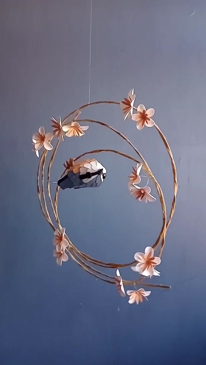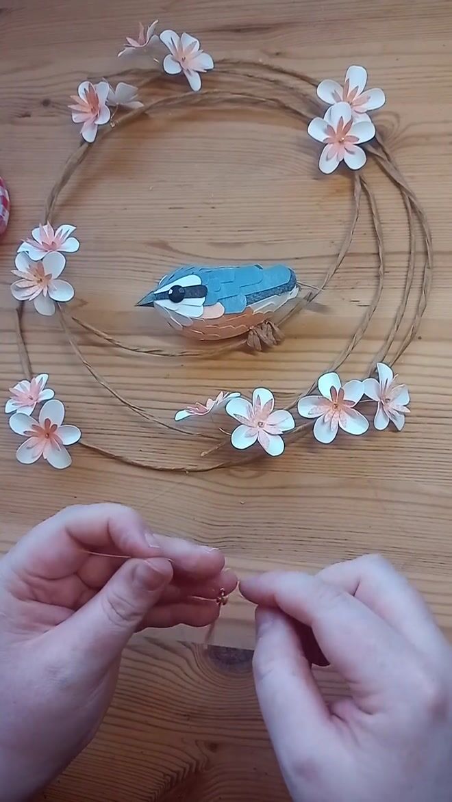 This floral wreath features a nuthatch bird sculpture, scampering among pale peach hydrangea blossoms. The nuthatch is a paper sculpture, made from recycled hand printed papers. His pose, colour palette and feather markings are unique to him. He hangs upside down, as nuthatches are so very fond of doing. He is varnished with a UV protective lacquer, so he'll happily hang in a sunspot on your wall, just as well as any shady, cosy nook, to bring cheer to your décor. The paper is layers upon layers of 300 GSM cardstock, which makes him very sturdy.