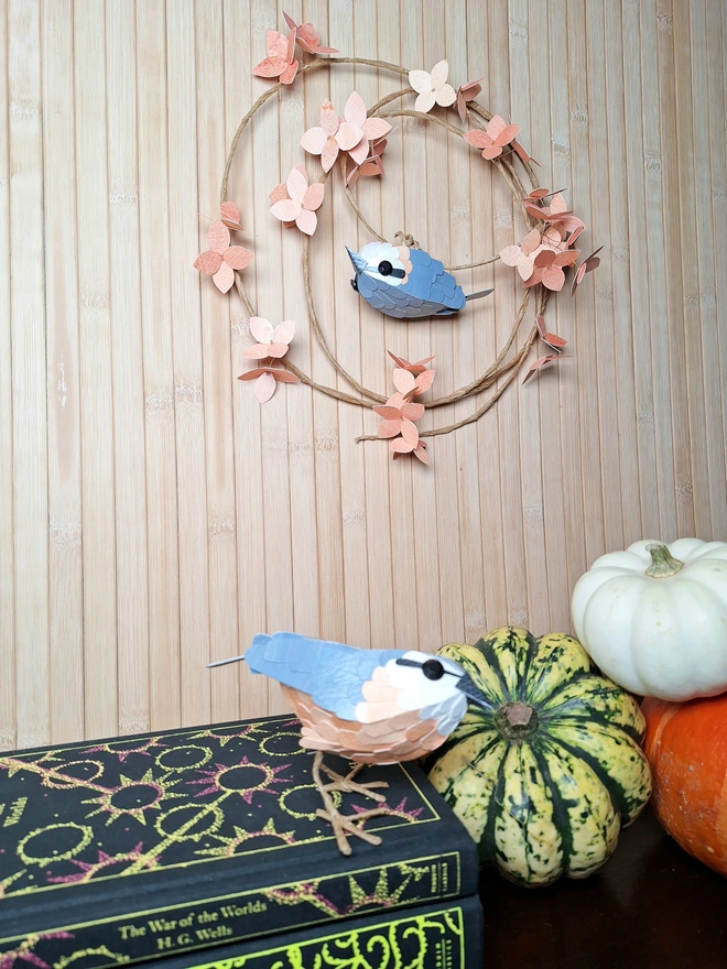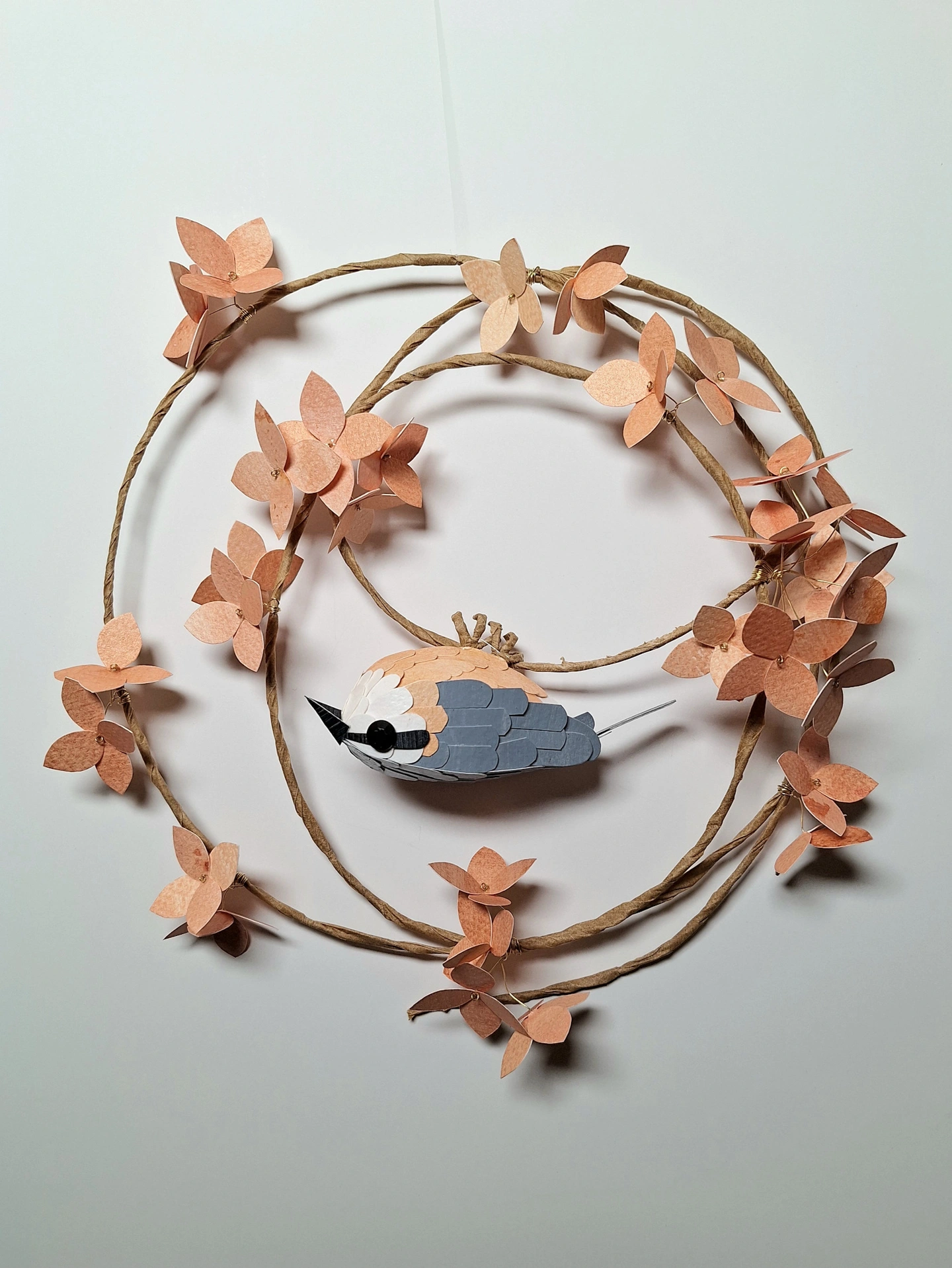This floral wreath features a nuthatch bird sculpture, scampering among pale peach hydrangea blossoms. The nuthatch is a paper sculpture, made from recycled hand printed papers. His pose, colour palette and feather markings are unique to him. He hangs up...