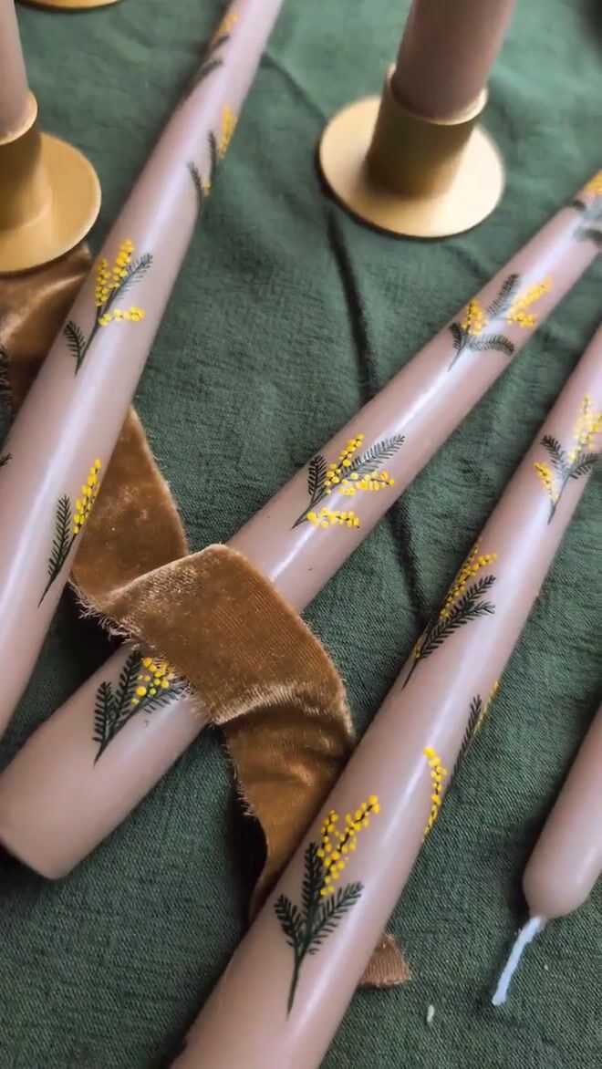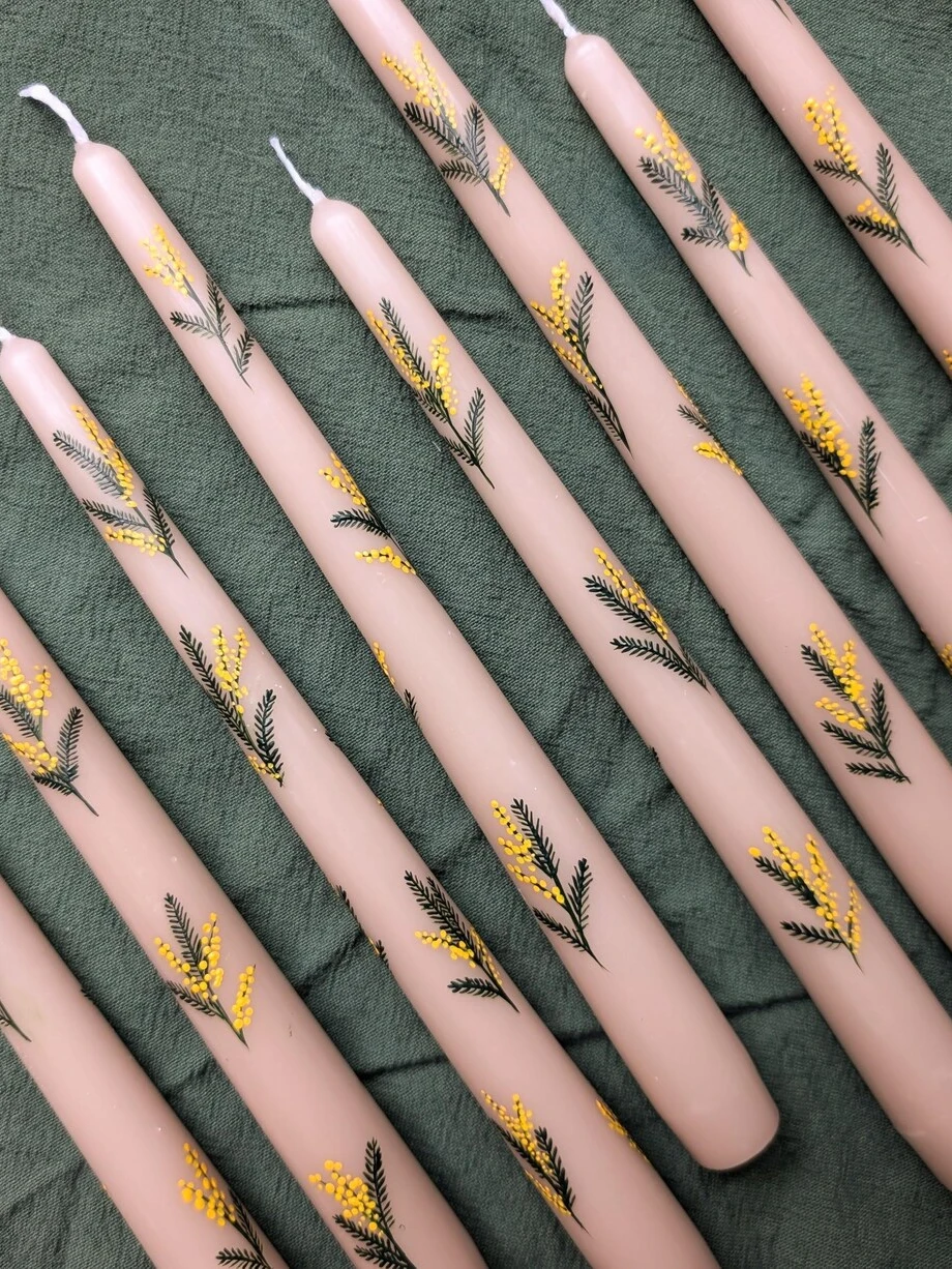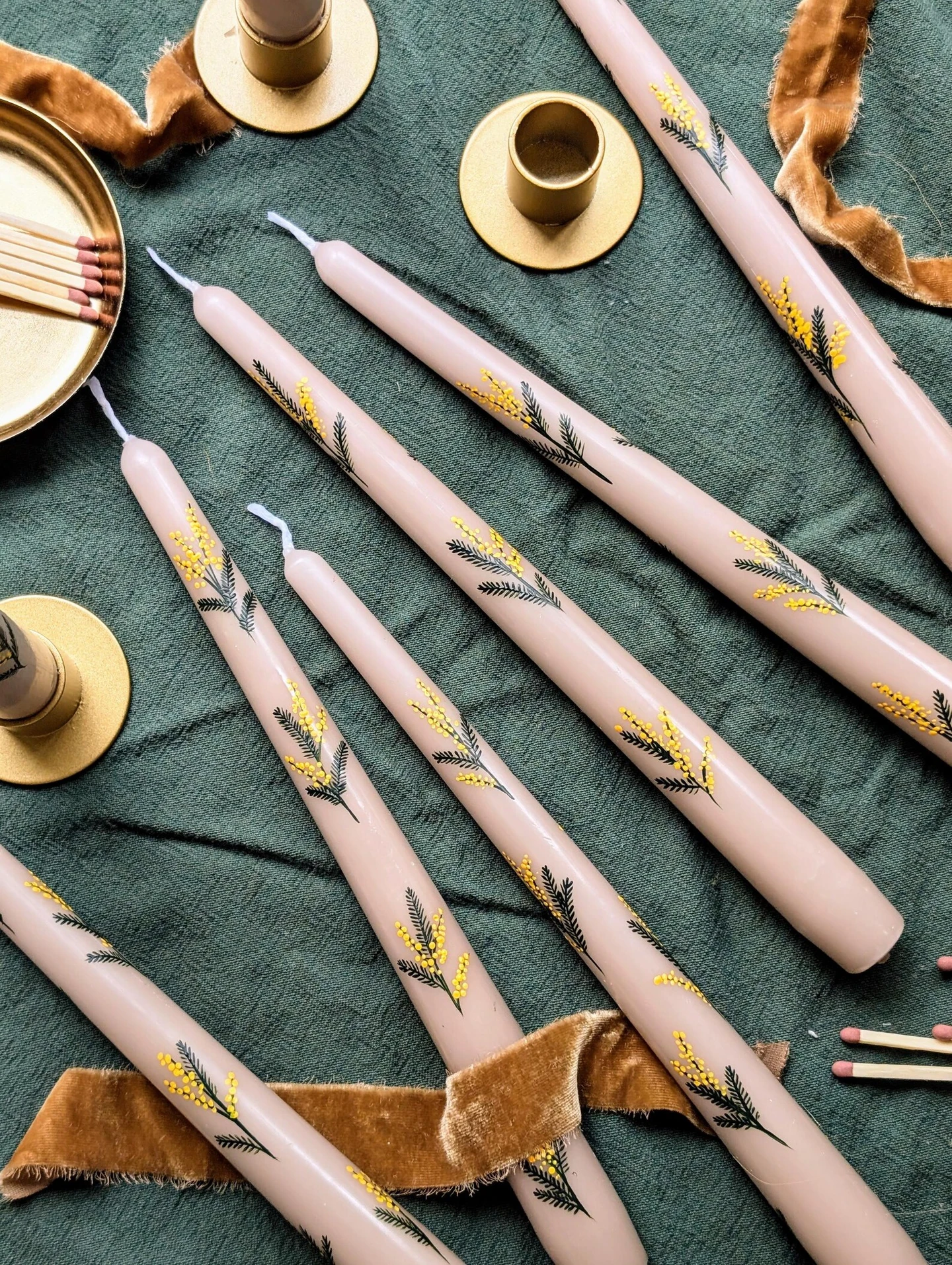 Oat-Coloured Hand Painted Candle with Mimosa Design – Neutral Taper Candle – Decorative Dinner Candle – Unscented, Non Drip These oat-coloured taper candles are hand painted with delicate mimosa flowers in soft yellow and green – a subtle, botanical design that adds a natural touch to any dinner table, shelf, or celebration. Each candle is unscented and non-drip, making them ideal as decorative dinner candles or gifts. I paint every candle by hand in my London studio using a tiny paintbrush and non-toxic, water-based paints. Because each one is hand painted, every candle is unique.
