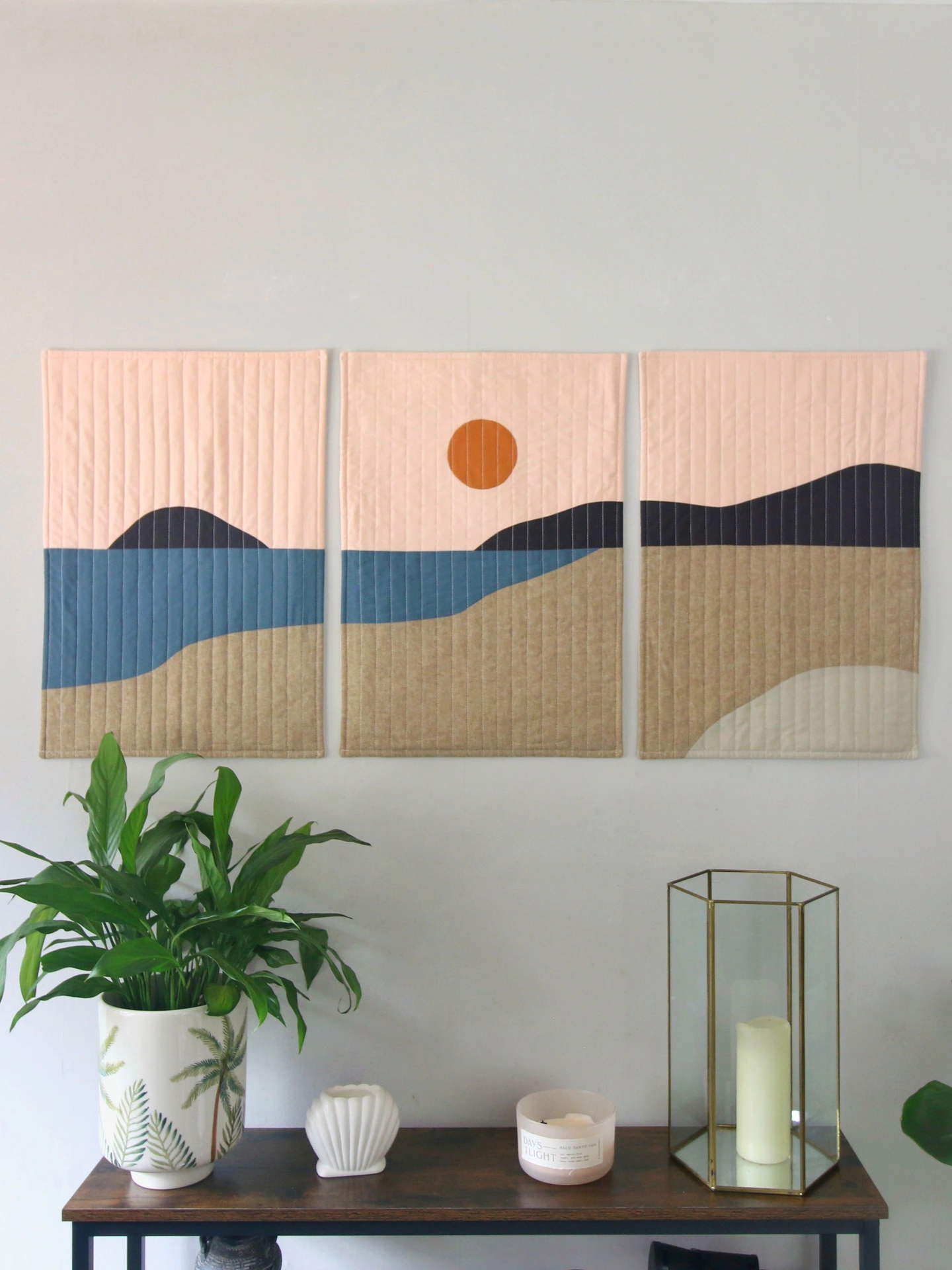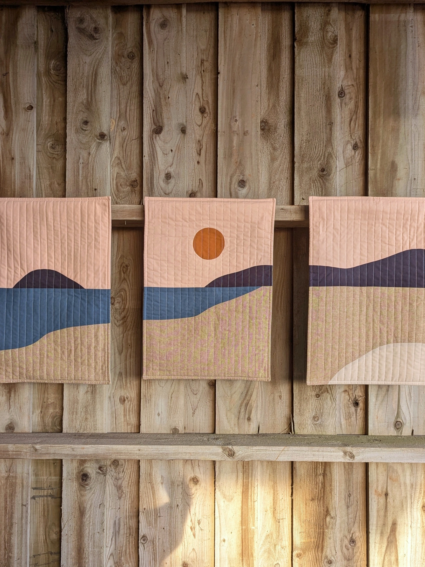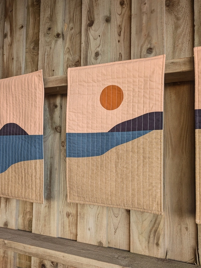This set of handcrafted quilt wall hangings features a serene beach scene, making it an ideal accent above a bed or seating area to inspire a sense of calm. Made to order they feature a hanging sleeves on the reverse and a wooden dowels for easy display.
