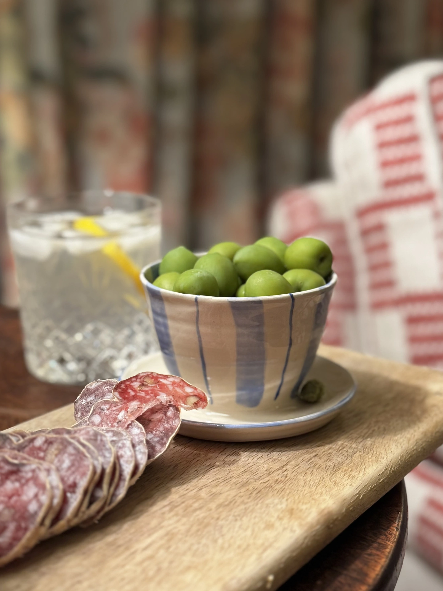 A perfect addition to your olive obsession. Olives in the dish & those pesky stones discarded in the surrounding dish! Where’s the cocktail please!