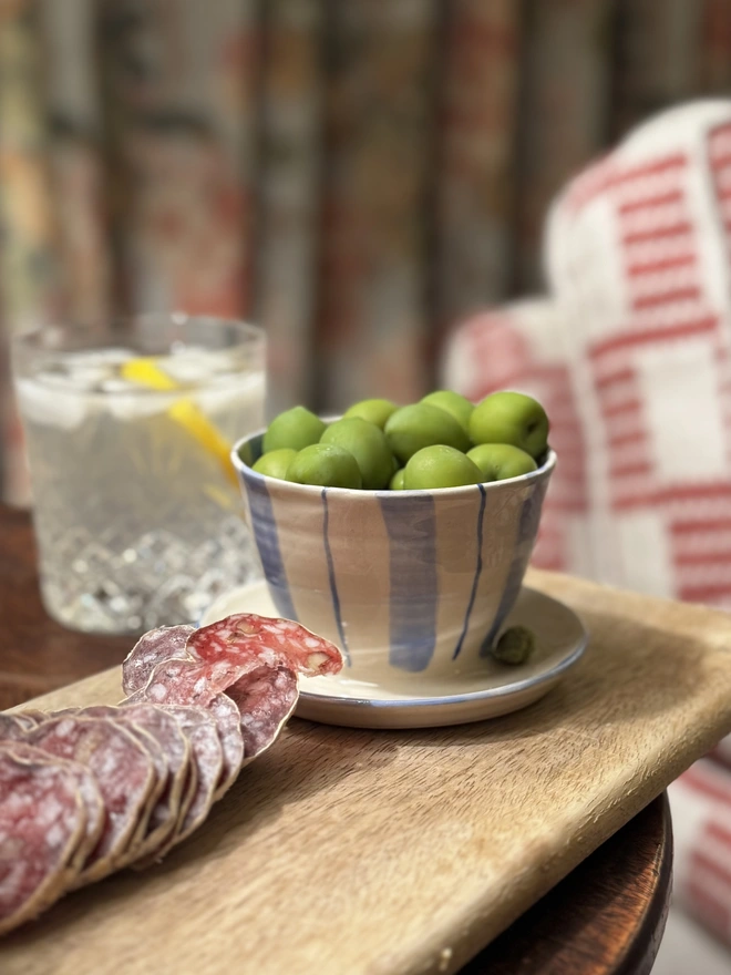 These handmade ceramic olive dishes are made in stoneware clay and hand painted in colourful blue and blue stripes or pink and red stripes.