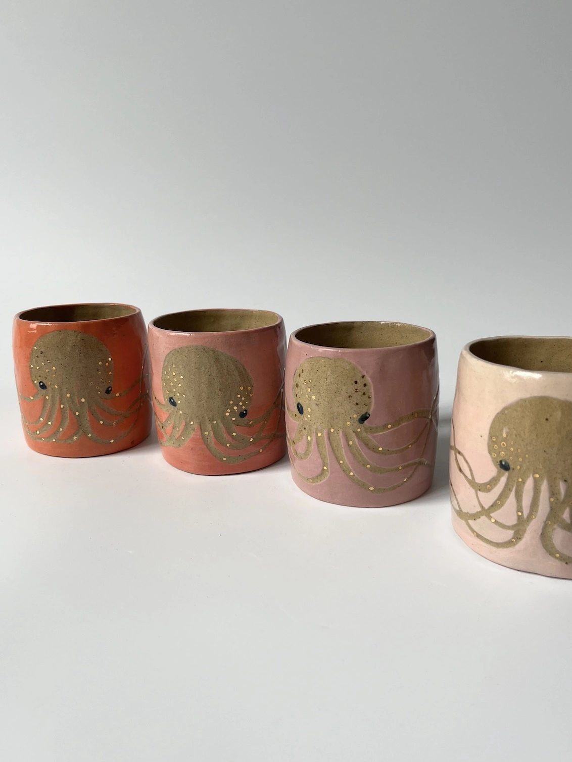 Stoneware mugs with octopus motive on the outside. The pinks range from more peach into delicate pink