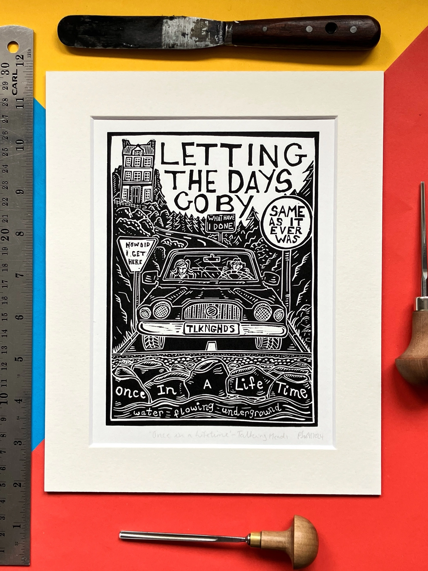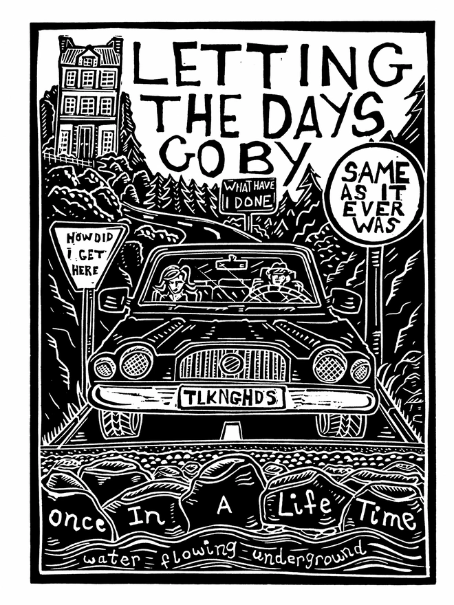 Original linocut print inspired by lyrics from the song 'Once in a lifetime' by Talking Heads, from their album 'Remain in Light' from 1980.