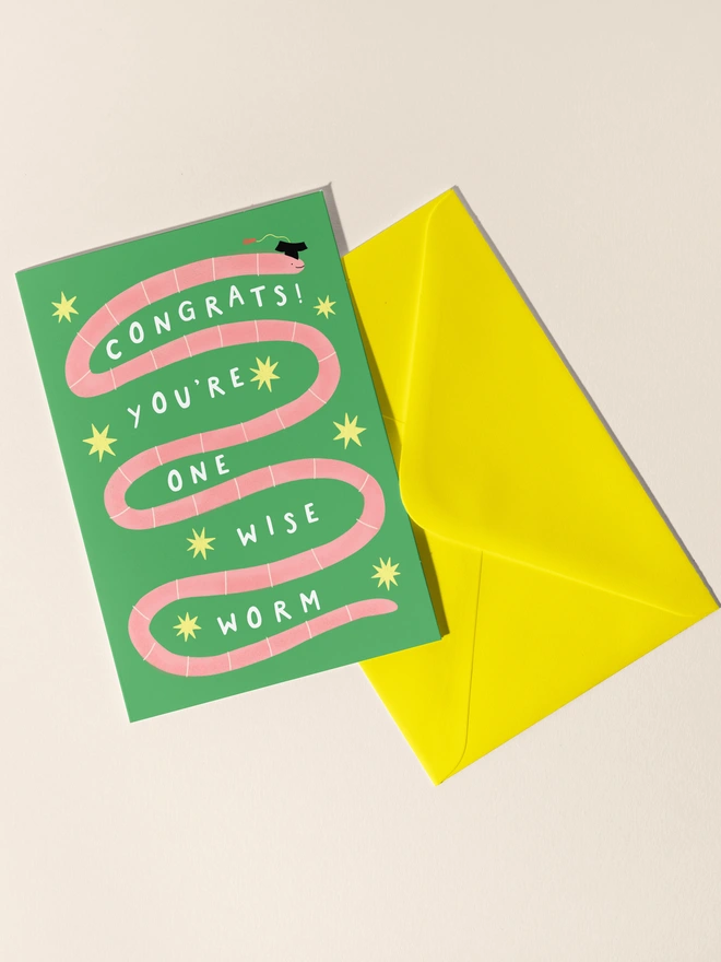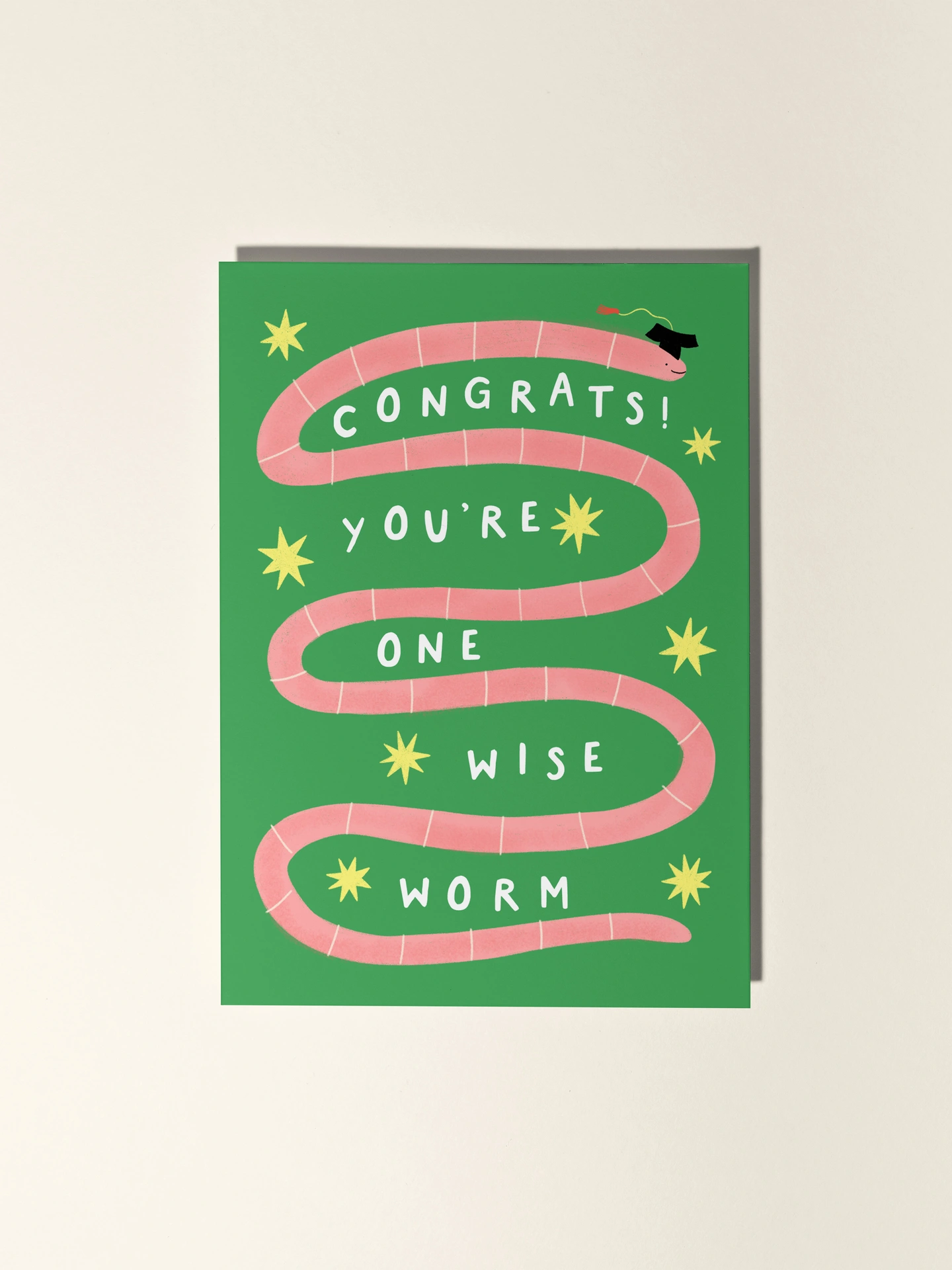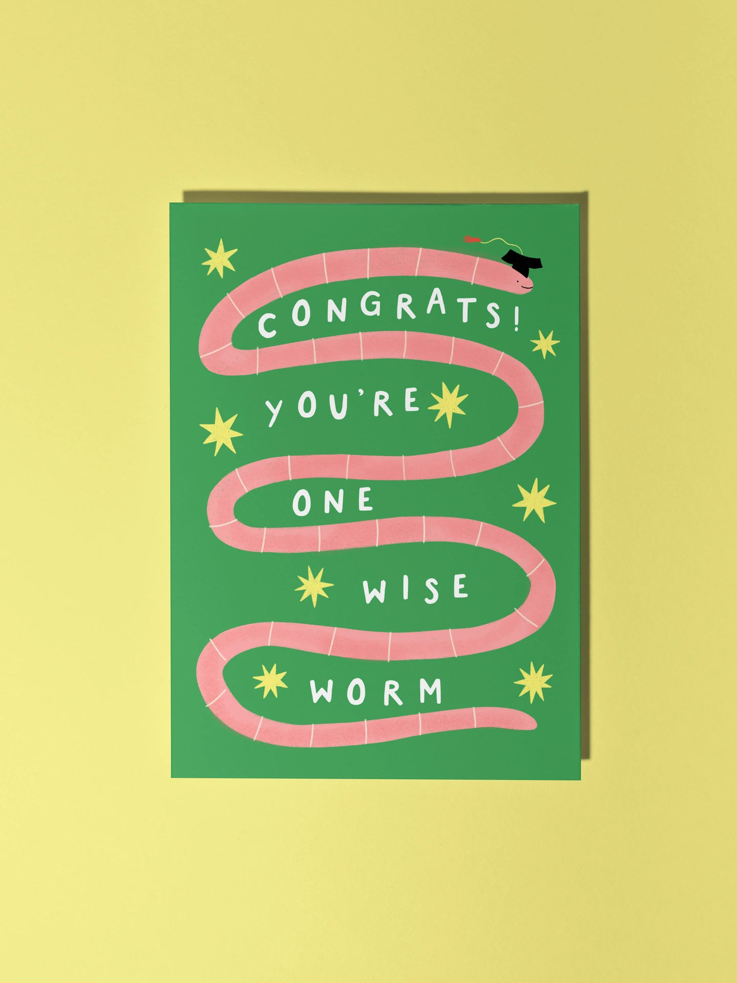 Fun contemporary graduation card suitable for everyone. Featuring worm in a graduation cap against a green background. Text reads 'Congrats! You're One Wise Worm'...