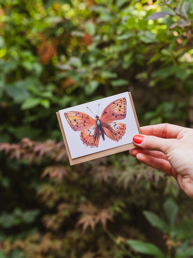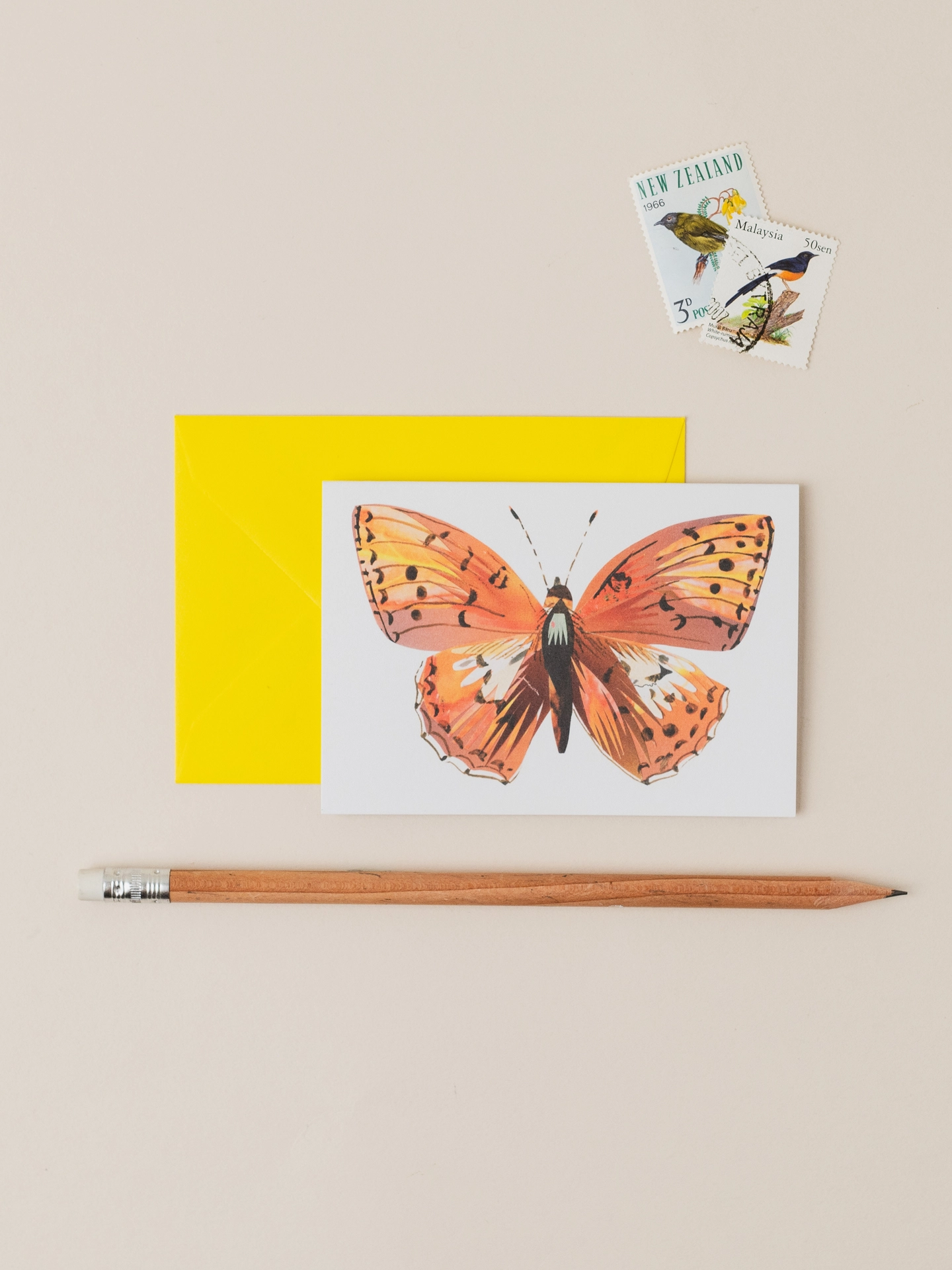 Share a flutter of colour with this charming mini card featuring an orange butterfly illustration. The original artwork was lovingly created by Kate Slater, using her signature handmade mixed media collage technique.