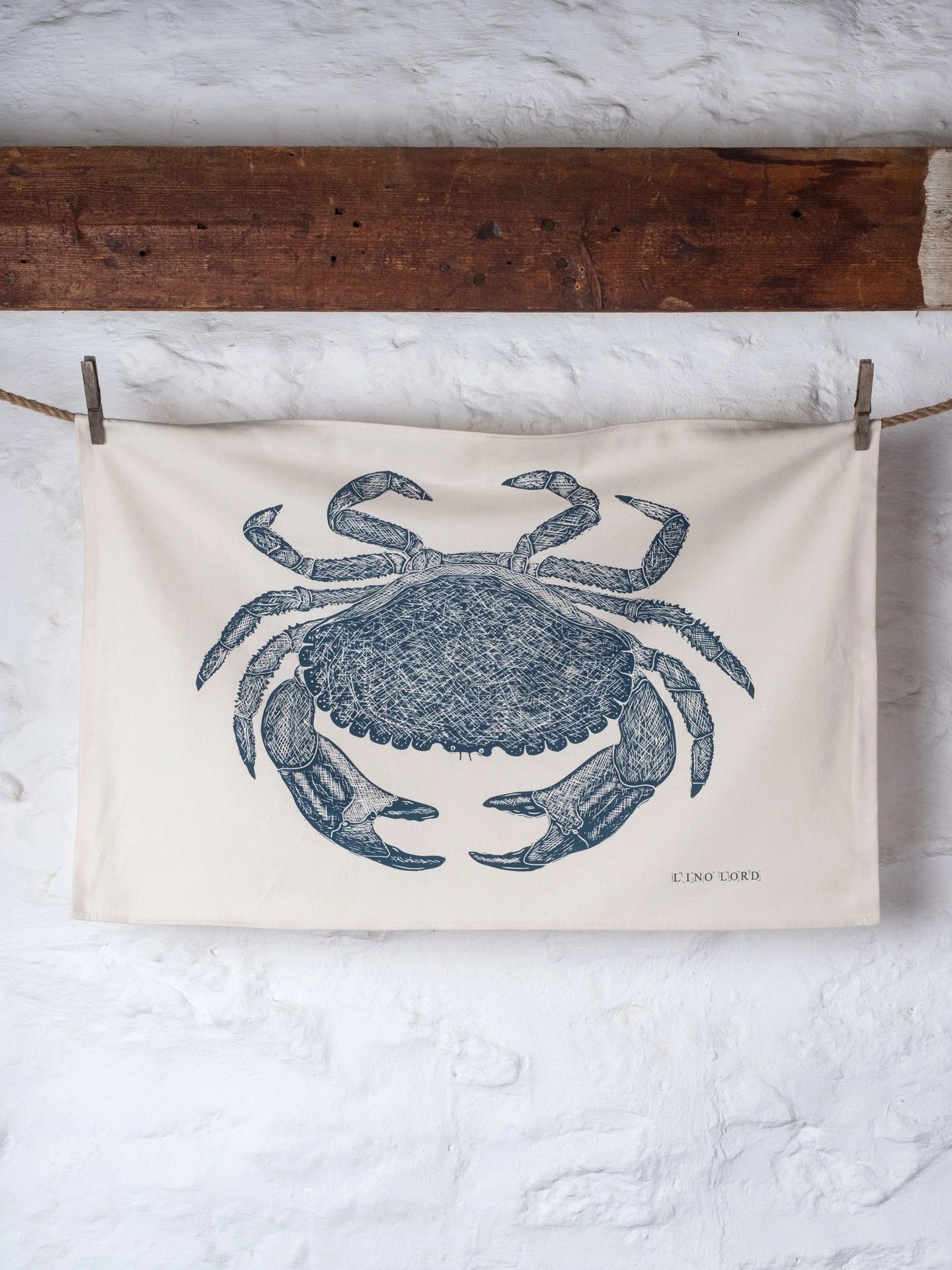 Organic Cotton Tea Towel with my original Brown Crab Lino print.
