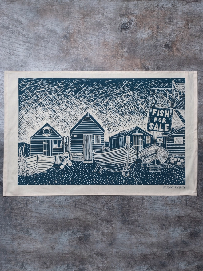 Organic Cotton Tea Towel with my original Fishermans Huts, Southwold Lino print...