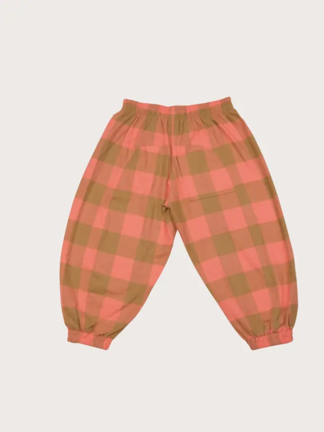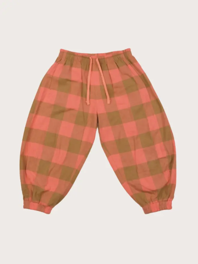 The Otis trouser redefines casual wear with its wide-leg rounded silhouette and pulled-in leg cuffs. Made from soft, brushed flannel cotton in coral check. The gathered cuffs and elastic waistband create that signature Studio Koter cocooning silhouette.