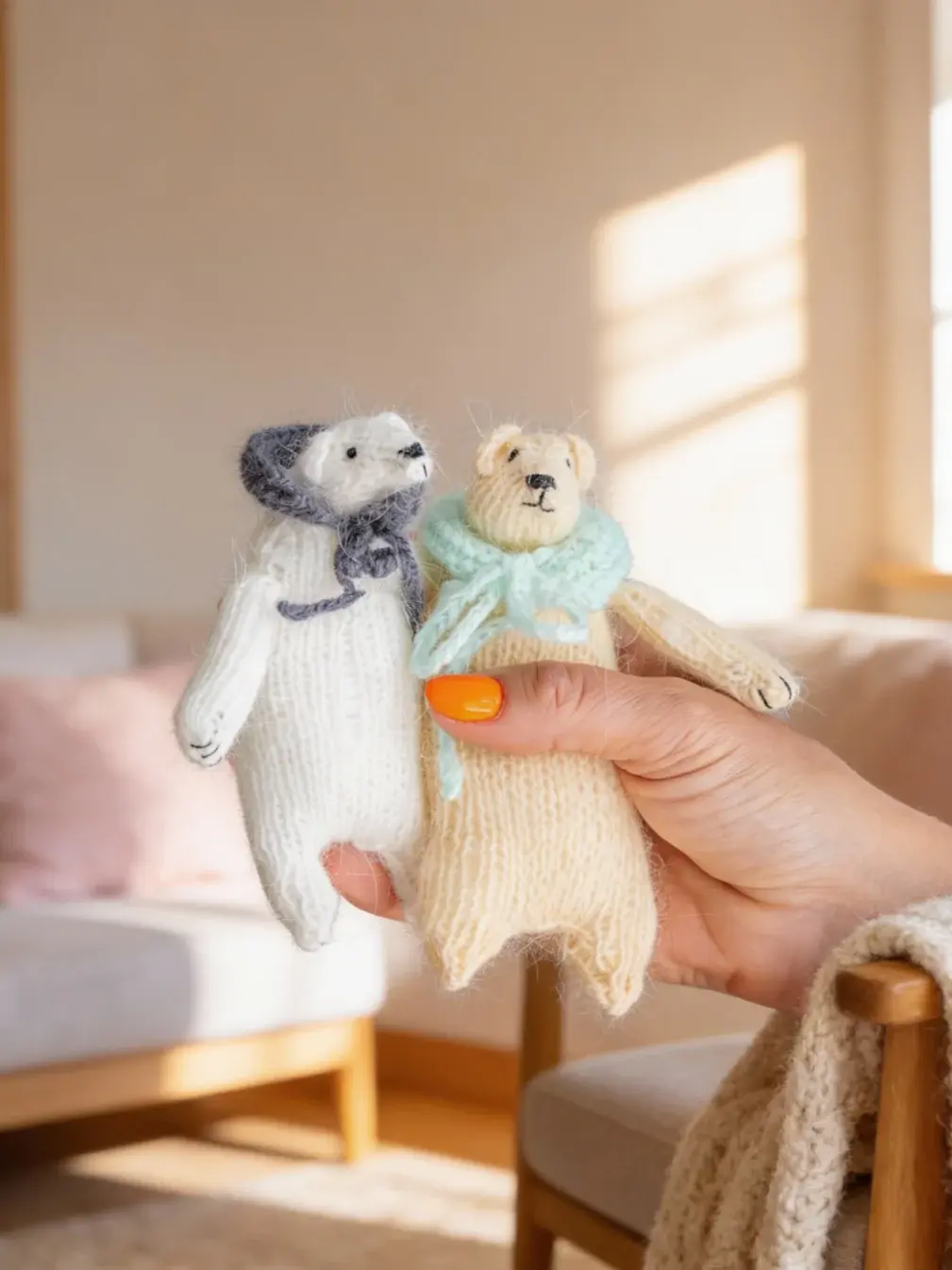 Hand knitted from exquisitely soft cashmere yarn, Ottilie is beautifully comforting to hold. She is available in classic white or warm cream and wears a delicate shawl tied gently over her shoulders, finished in either soft grey or mint. Thoughtful details, from her tiny embroidered eyes, nose, and claws to her sweet little bobble tail, give her a timeless, heirloom quality.