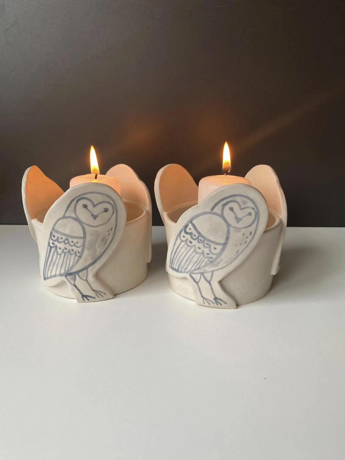 Owl candle holders for votive candles and large tea light candles. Hand made with slab rolled outlines of the owls which are worked onto little dishes thrown on the wheel. Using a scoring and clay slip method to attach the owls when both the small dish an...