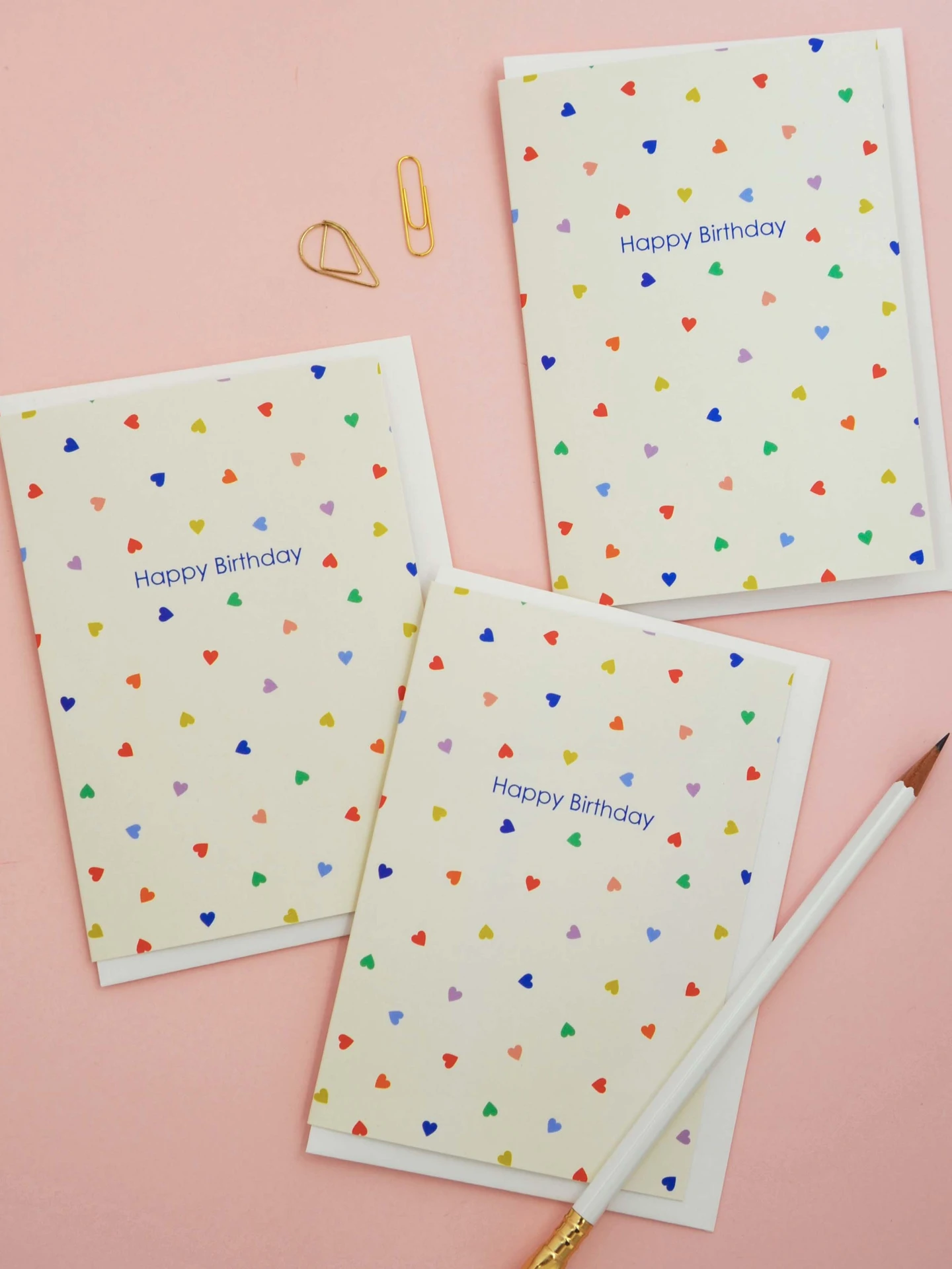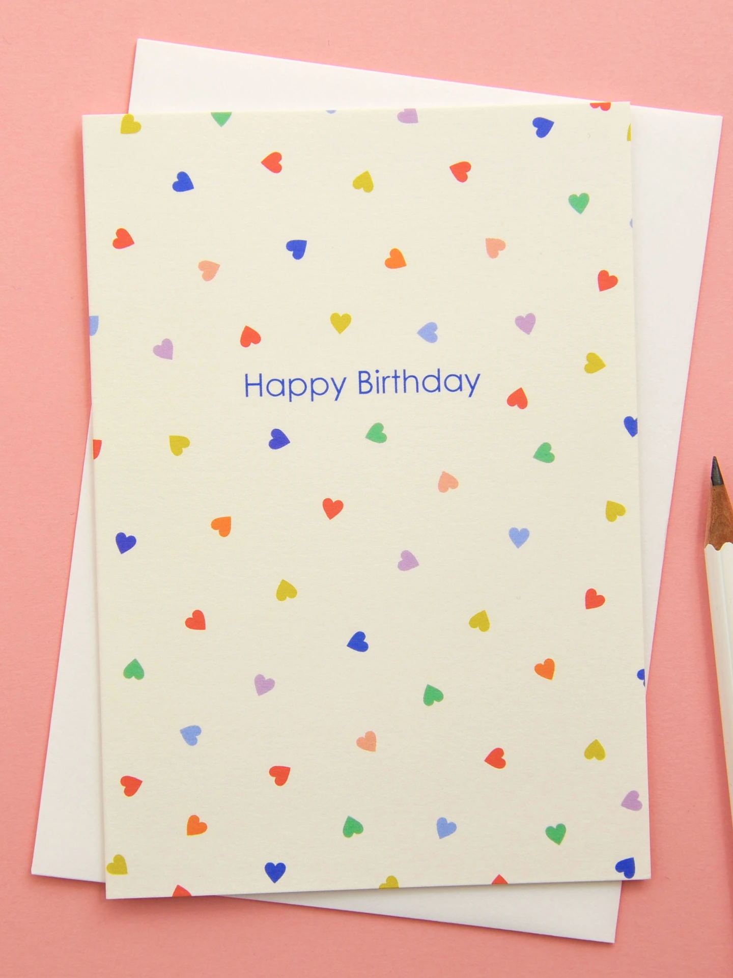 A pack of 6 pretty and joyful birthday cards featuring a scatter of colourful ditsy hearts in blue, lilac, orange, red, pink and yellow, set against a soft cream background. Finished with a simple “Happy Birthday” message in deep blue, this design feels l...