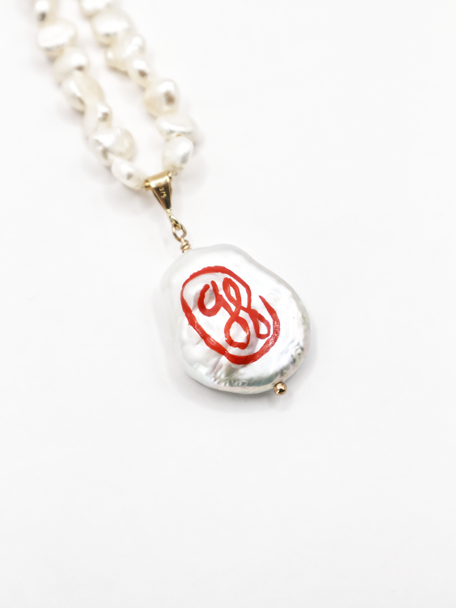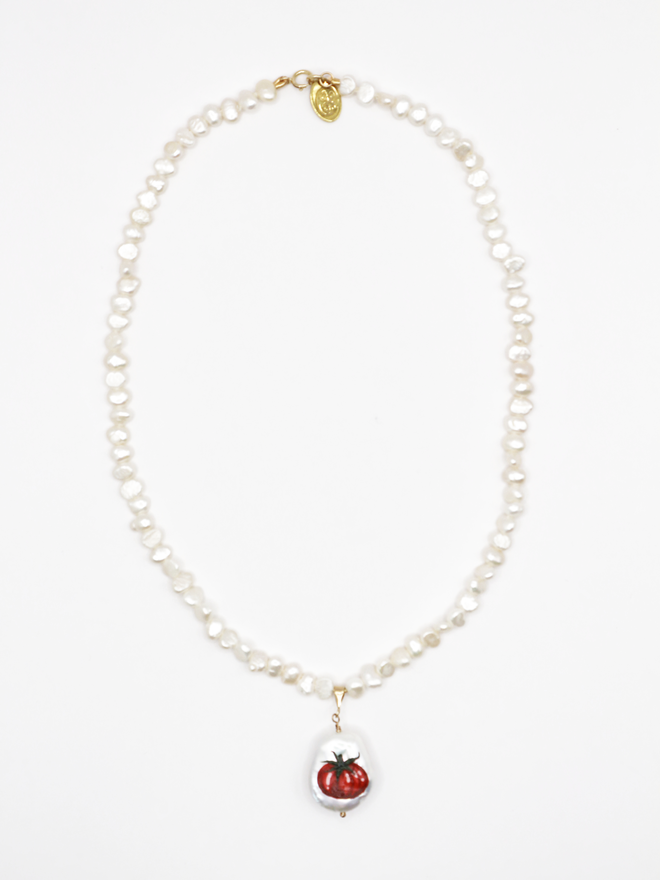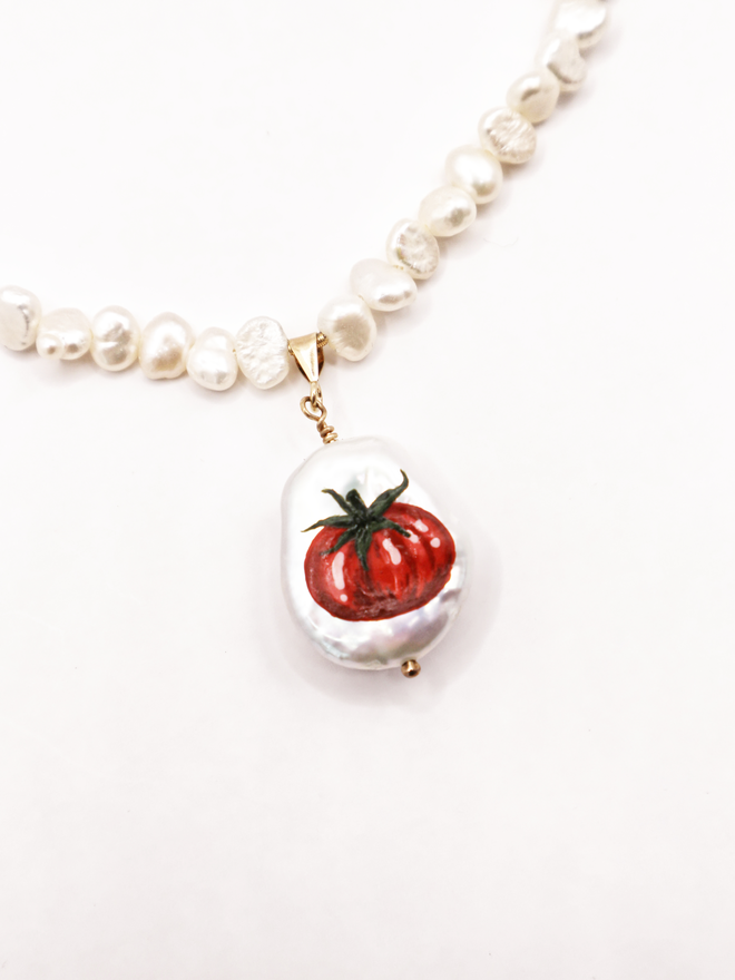 A fresh water pearl necklace with a petal shaped pearl pendant hand painted with a tomato motif.