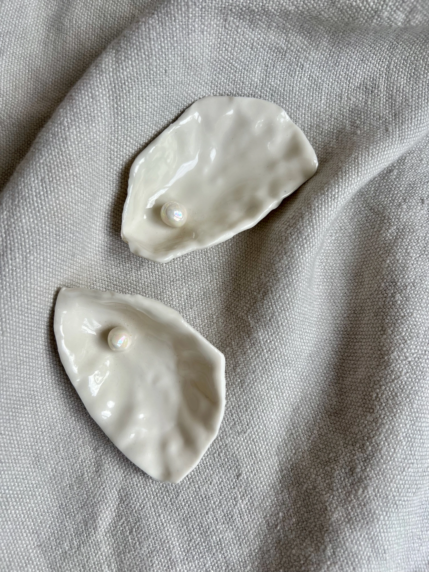 A pair of oyster dishes, each featuring a lustre pearl - perfect for salt & pepper, trinkets or to brighten any room.