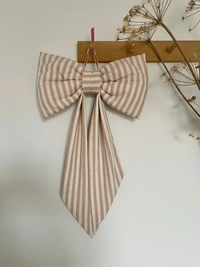 A beautiful oversized bow handmade from a pretty pale blush pink stripe cotton fabric.