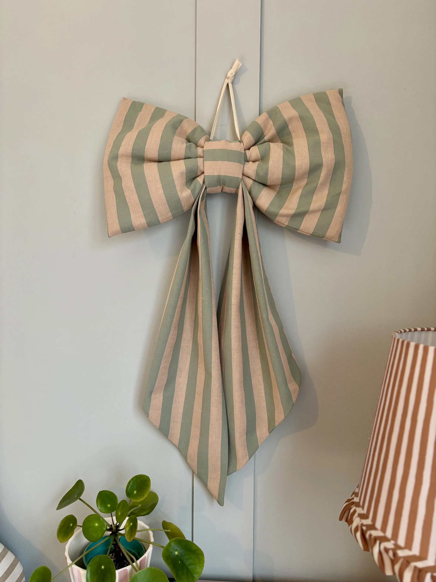 A beautiful oversized bow handmade from a beautiful minty green and blush stripe linen/cotton blend fabric...