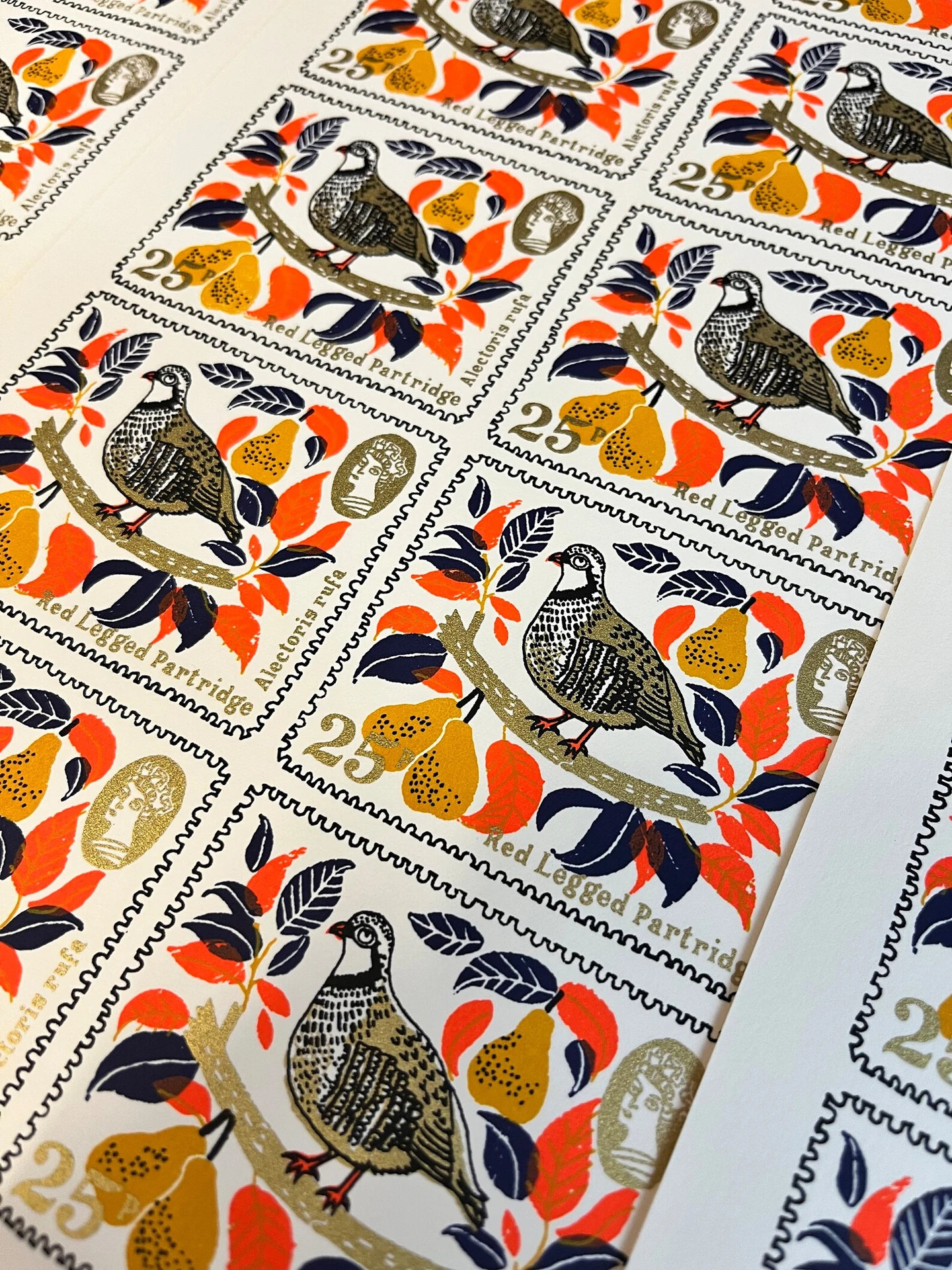 A chubby gold partridge in a pear tree on a (made up) stamp, mounted onto card. The perfect card for your true love (or best friend/someone nice)
