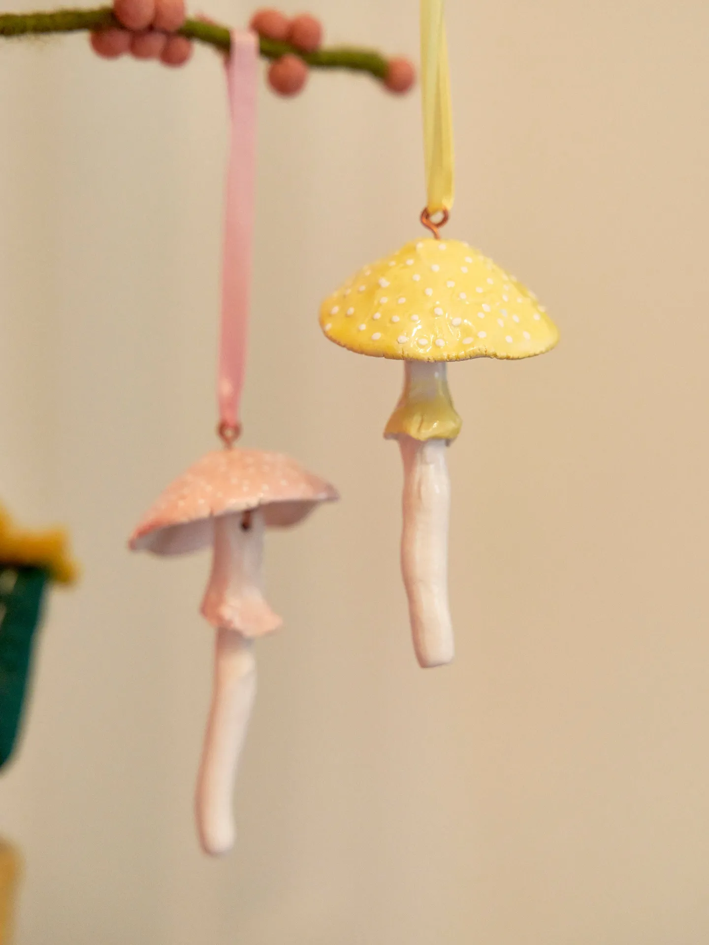 Each toadstool is individually crafted and glazed, with delicate white polka dots and a coordinating satin ribbon for hanging. They’re designed to add a subtle pop of colour without feeling overly “seasonal”, making them just as lovely for a spring refresh as they are for year-round styling.