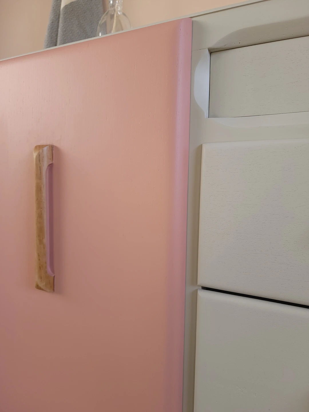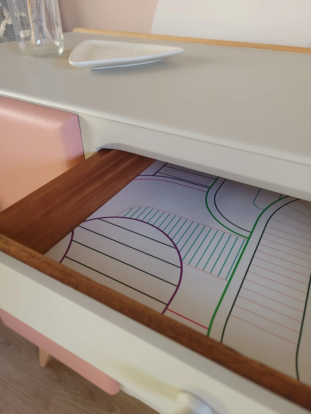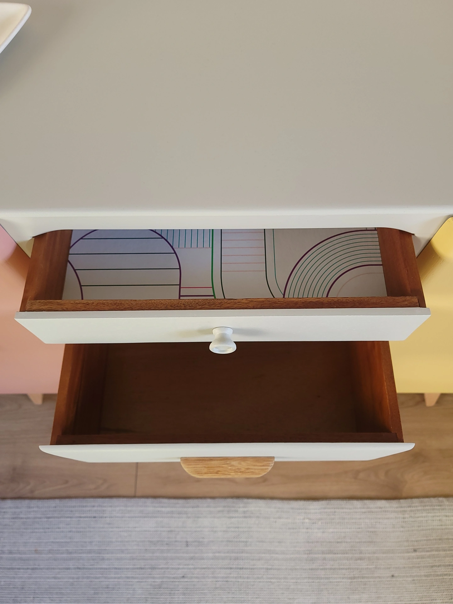 Painted with specialist durable furniture paints; peach, yellow and putty on the outside with a rusty pink inside the cupboards. The top drawer is lined with gorgeous paper with a subtle colourful geometric design. The legs and handles have been stripped, sanded and waxed for protection and that soft buttery feel.