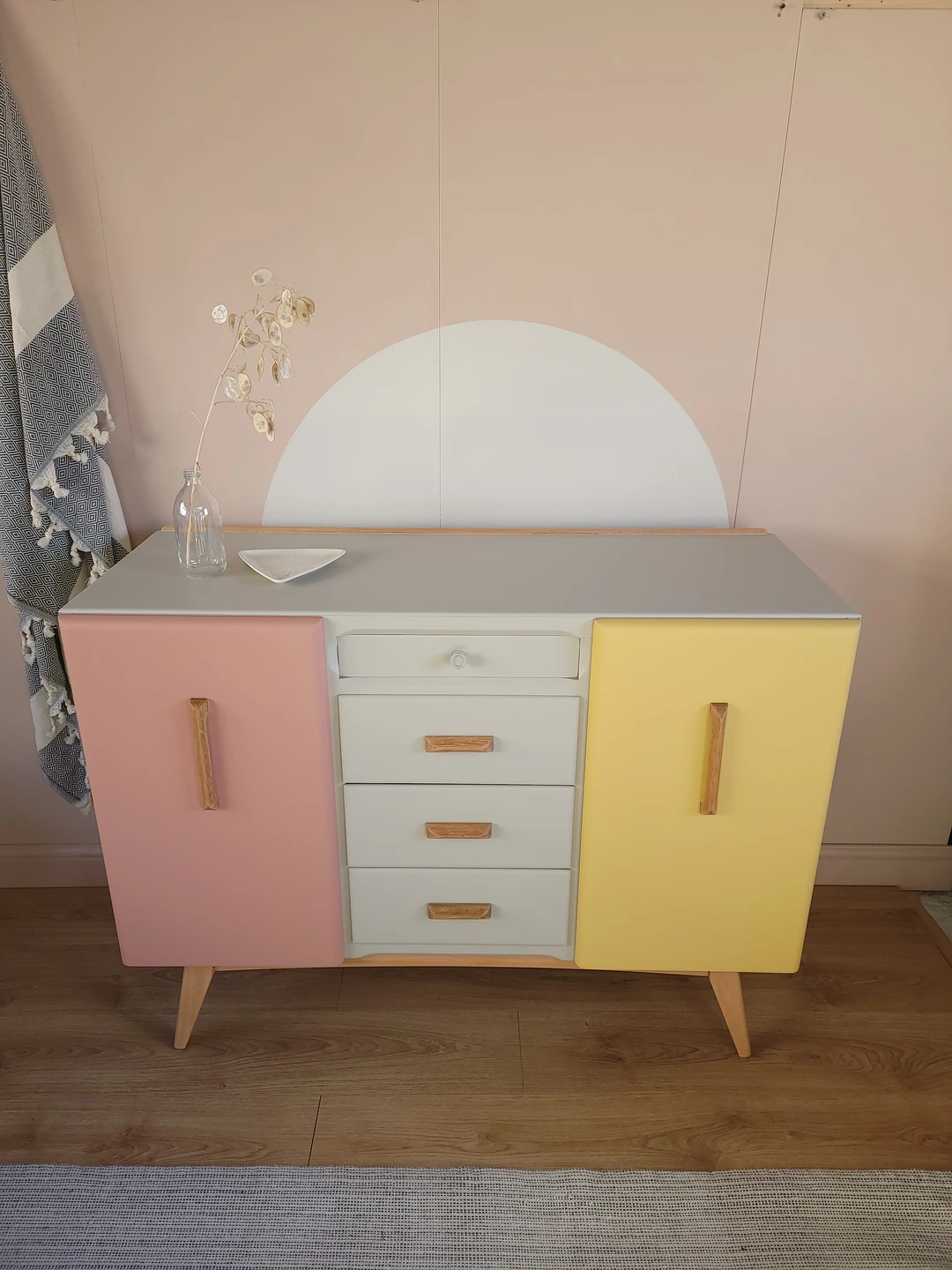 Soft sherbet pastels have elevated this fabulous vintage mid-century sideboard to bring a little ray of sunshine into your home. This is a one-off piece, your chance to own something truly unique and bring a little joy to your space. Great storage for a hallway, living or dining room - you can even use it as a drinks cabinet.