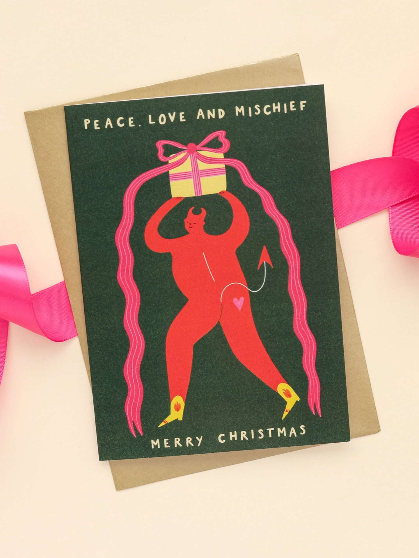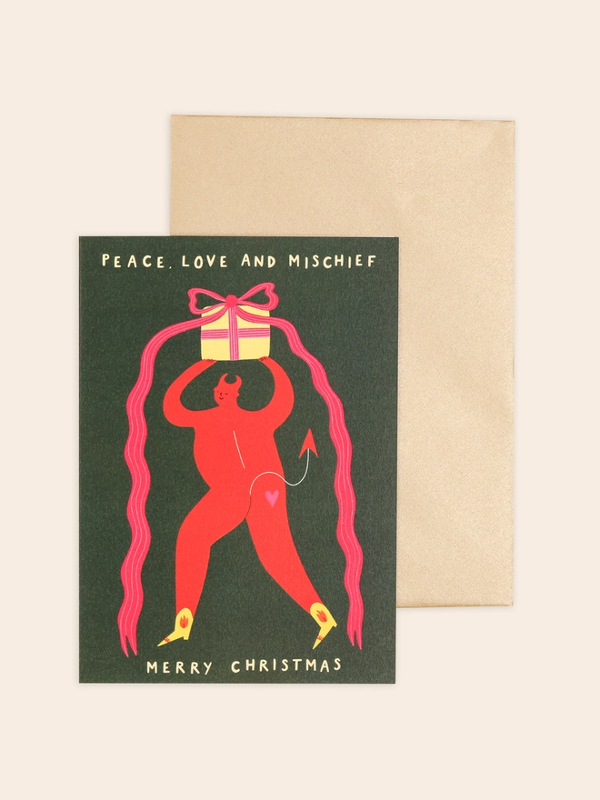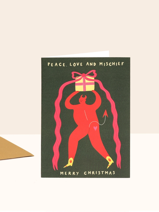 Cheeky Christmas Card featuring an illustrated winking devil holding a present. Type reads 'Peace, Love and Mischief, Merry Christmas'. A great non-traditional, modern option.