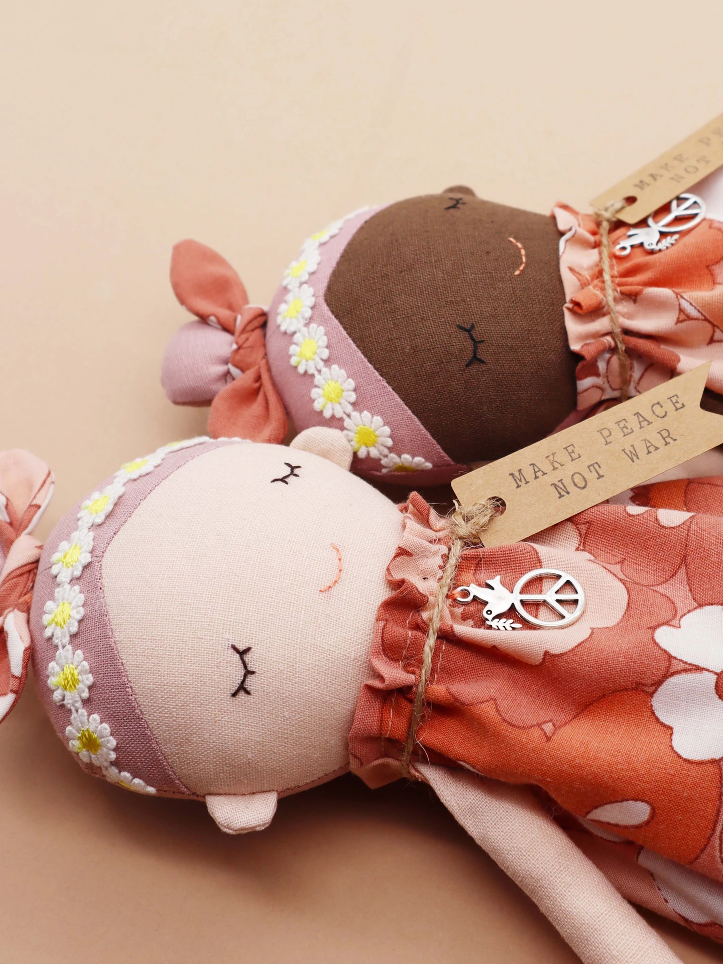 Handmade with love, each Peace Wishing Flower Child Doll carries a gentle message of harmony and kindness. Dressed in a retro-inspired floral dress in soft peachy tones, she wears a daisy headband and a bow-tied topknot, capturing the free-spirited charm of the flower child era. Around her neck hangs a tiny silver peace sign charm, paired with a tag reading “Make Peace Not War”, a reminder of hope and compassion.
