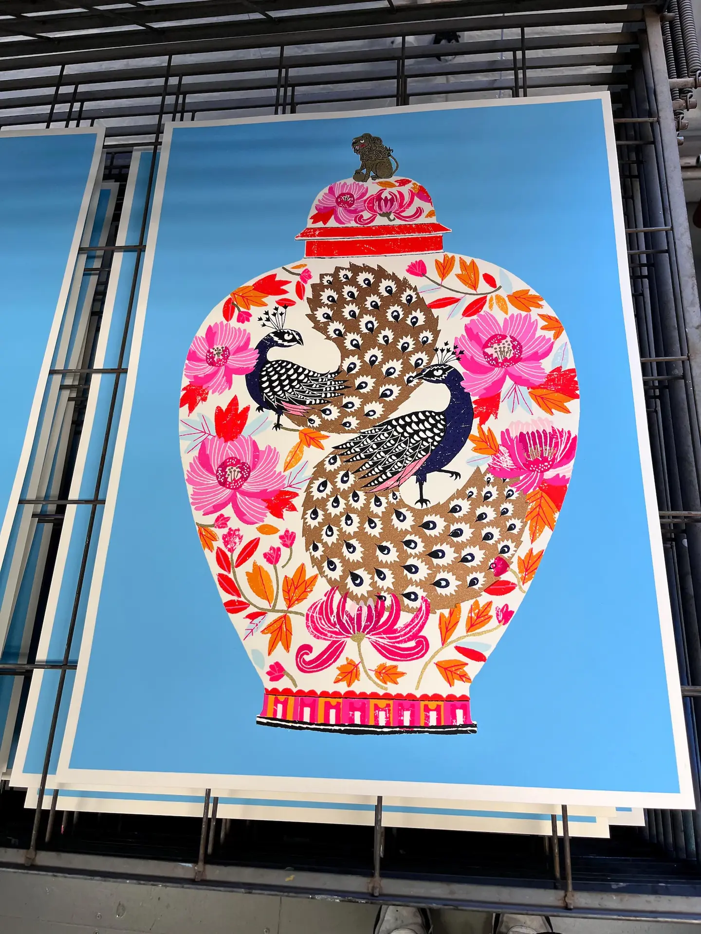 A handmade screen print of a Chinese inspired vase featuring two beautiful* peacocks with splendiferous golden tails. (*They definitely know they're an attractive pair)...