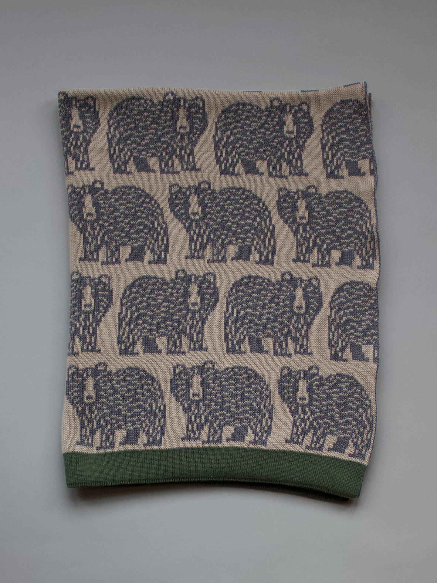 Good for a bear hug this one features a repeated bear design in grey marl on a linen marl background with a khaki green trim, the colours are reversed on the back.