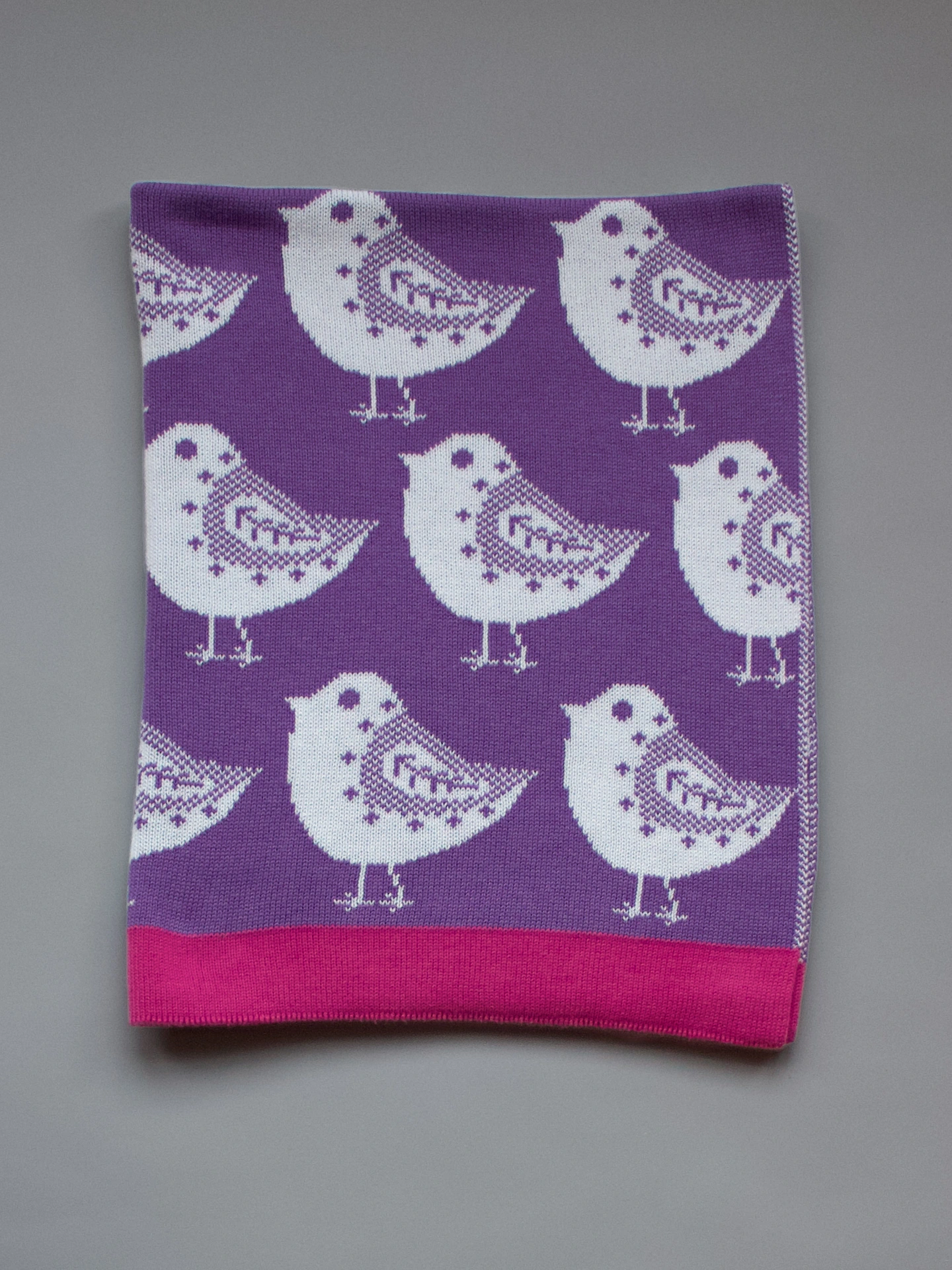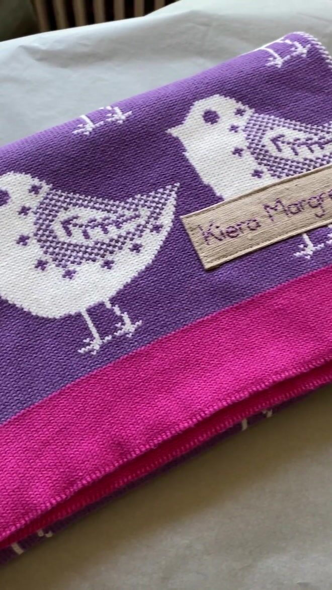 This one features a chirpy bird design in white on a purple background with a pink trim, the colours are reversed on the back.