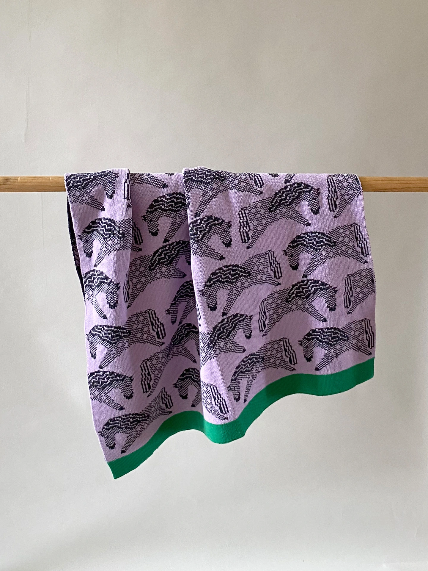 This is my dapple horse design available in blue and grey with a khaki trim or purple and grey with an emerald green trim, the colours are reversed on the back.