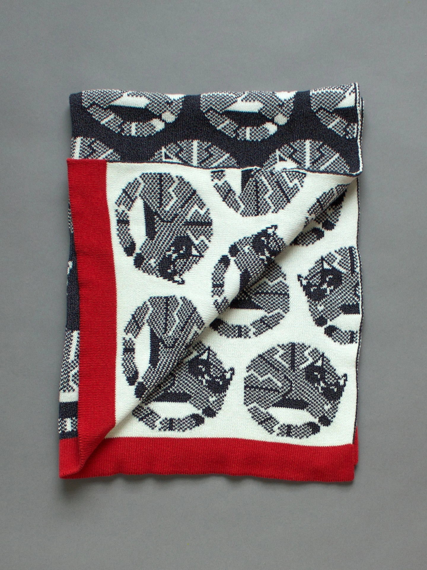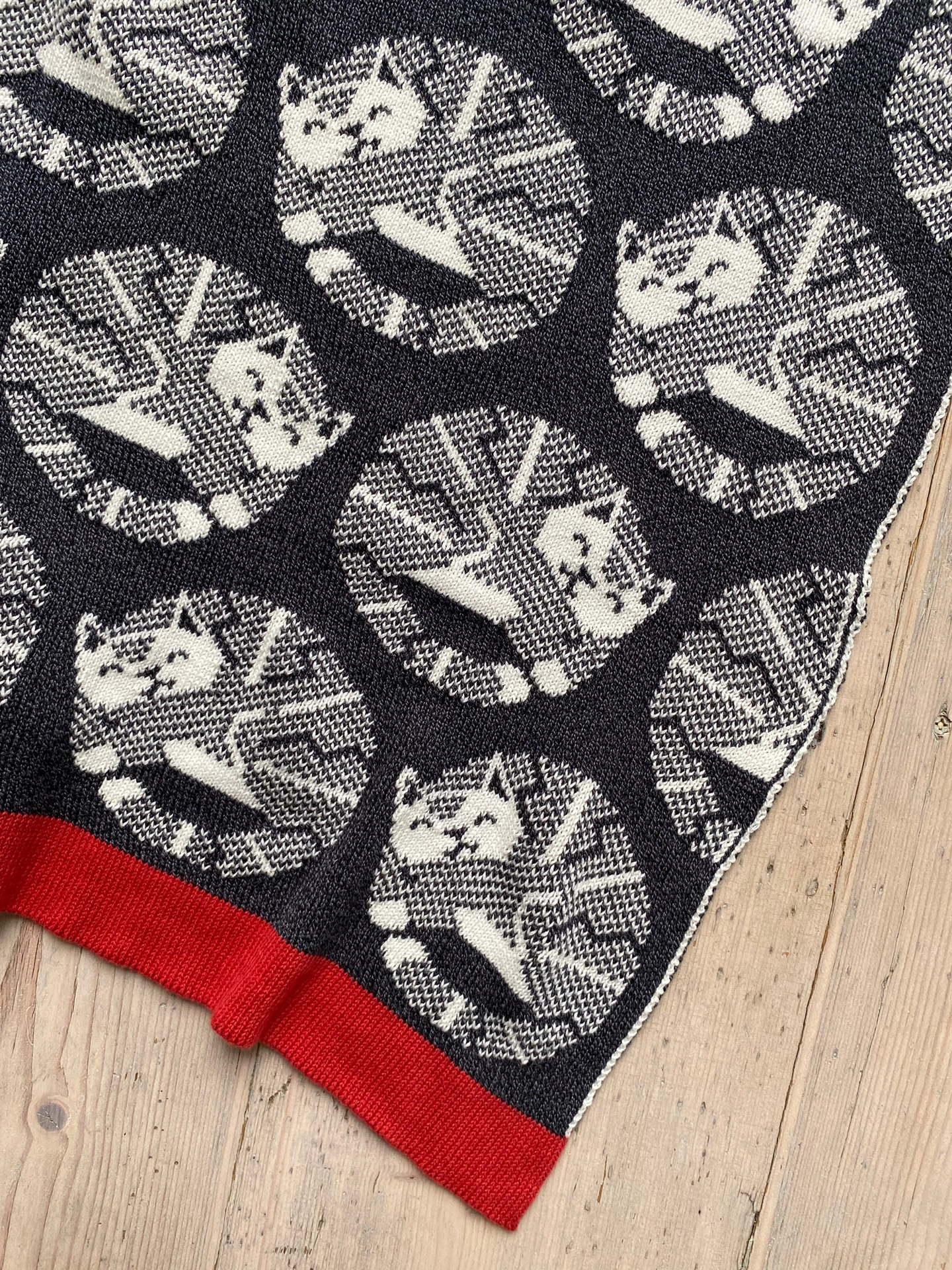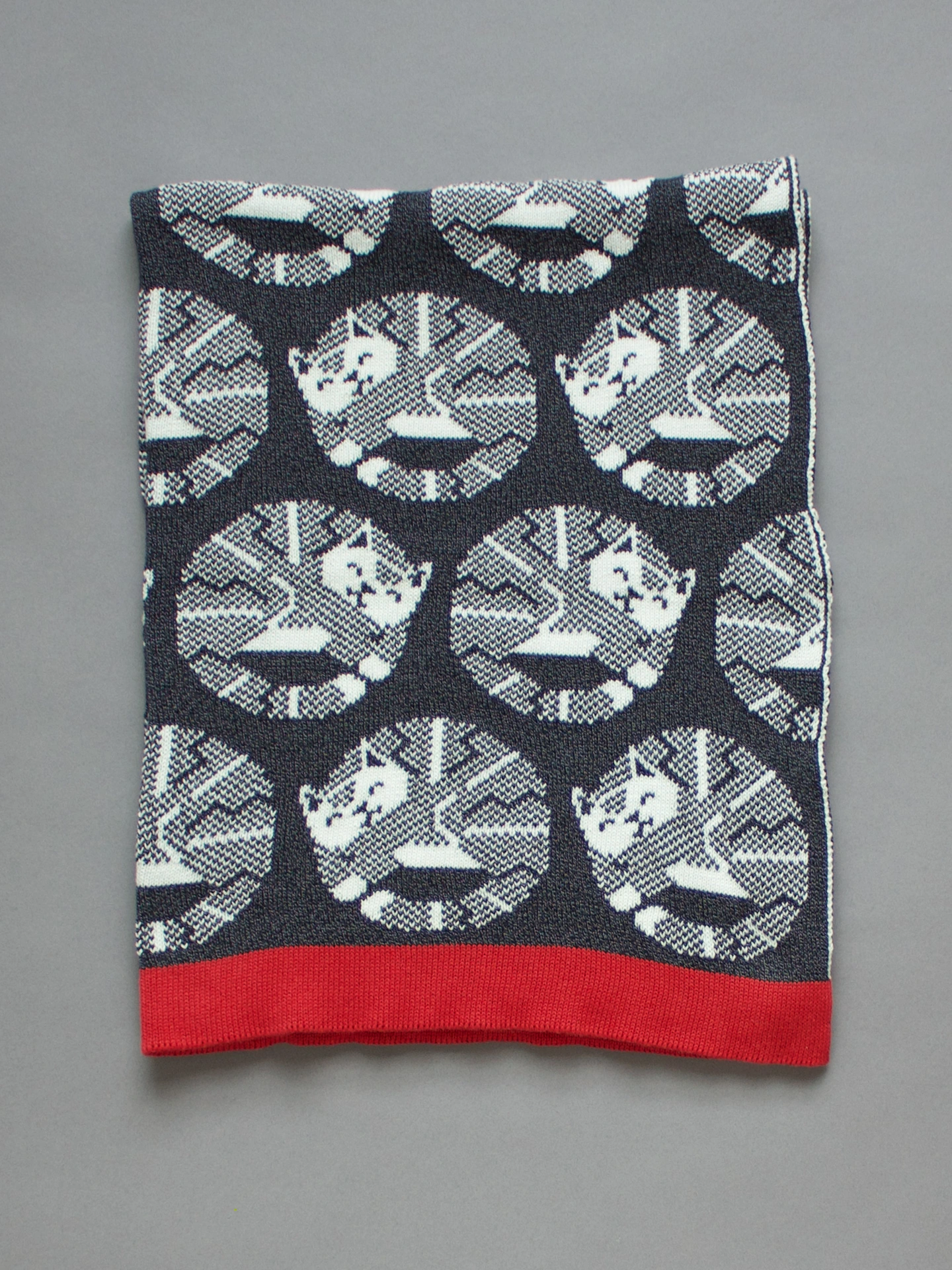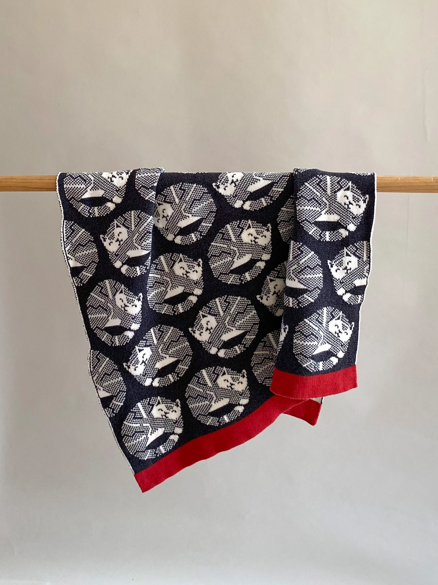 This one features a sleepy curled up tabby cat on a charcoal grey marl background with an orange trim, the colours are reversed on the back.