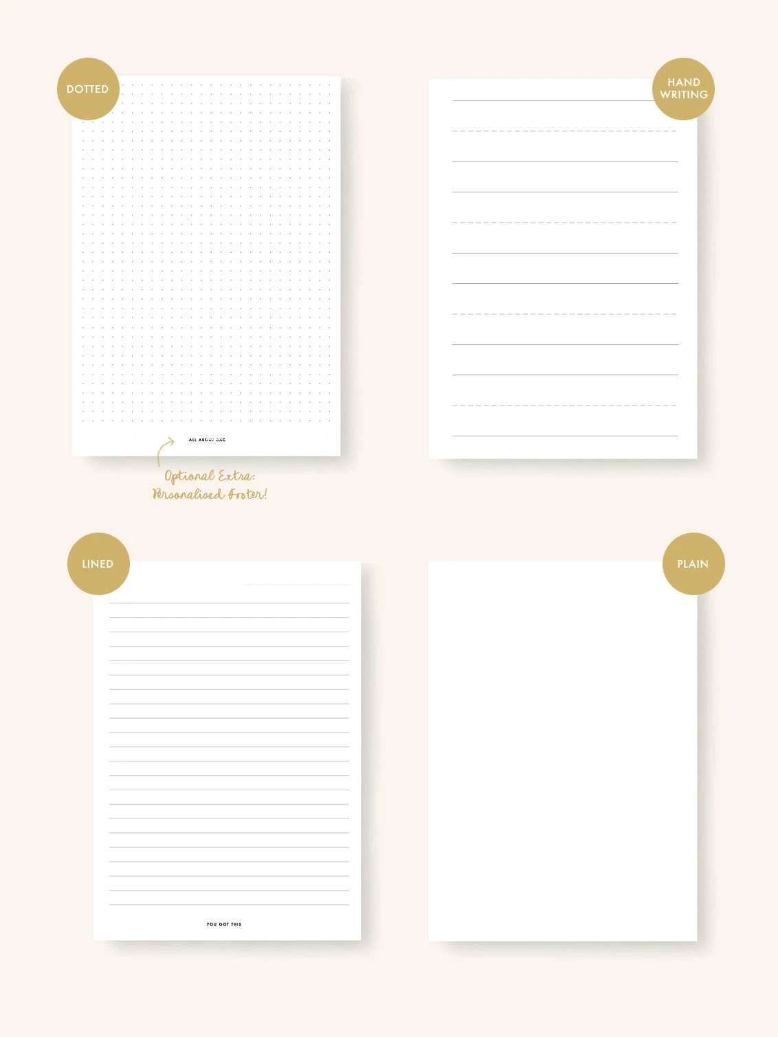 Each book features a sewn binding so it opens completely flat — ideal for writing, doodling, and creative adventures. The covers are durable and wipe-clean, making them perfect for keepsakes and adding to memory boxes. We have four different paper types available. We have handwriting paper, perfect for early years education as children are learning to write. You can capture your child's first letters and keep it as a keepsake book! We also have plain, dotted and lined.