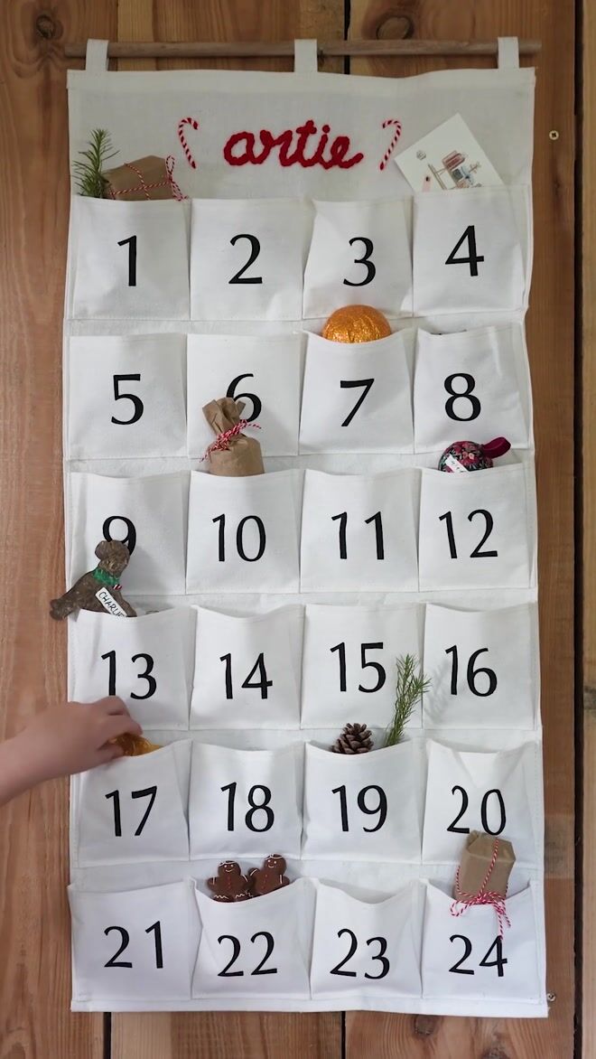 Make the countdown to Christmas extra special with my beautifully embroidered advent calendars. Each one is lovingly personalised with your little ones chosen name in festive red, finished with candy-cane style detailing for a touch of holiday magic. Made from durable fabric with a natural, timeless look, this hanging advent calendar features 24 roomy pockets-perfect for filling with little treats, trinkets, or tiny toys to delight each morning in December. The simple black numbering adds a modern twist, while the classic design means it can be treasured and reused year after year. Whether you're starting a new family tradition or gifting a loved one their very own Christmas countdown, this timeless advent calendar will bring joy, excitement, and a sprinkle of nostalgia to the festive season.