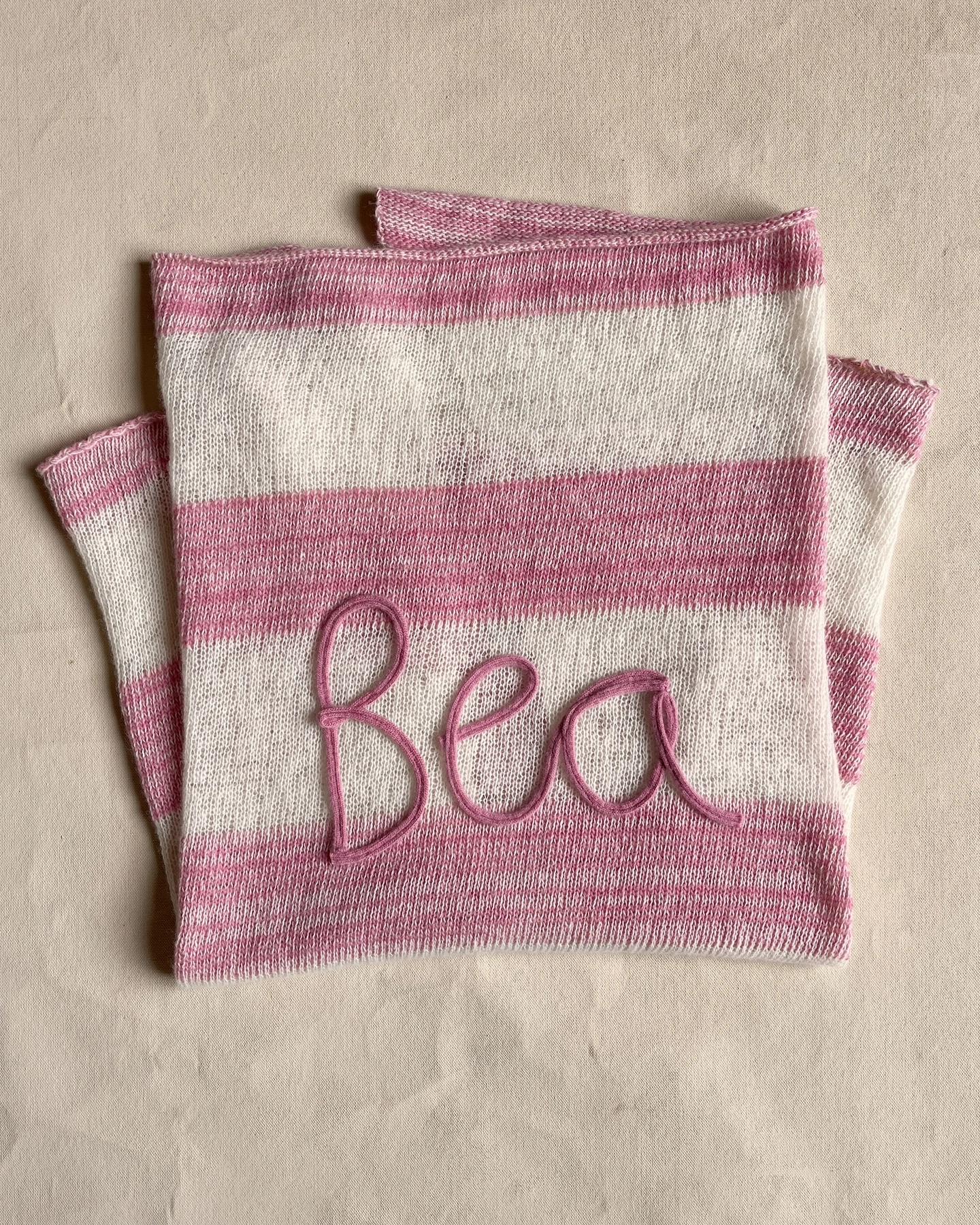 Personalised baby blanket in pink tint and ecru, made of 100% Super Geelong wool.