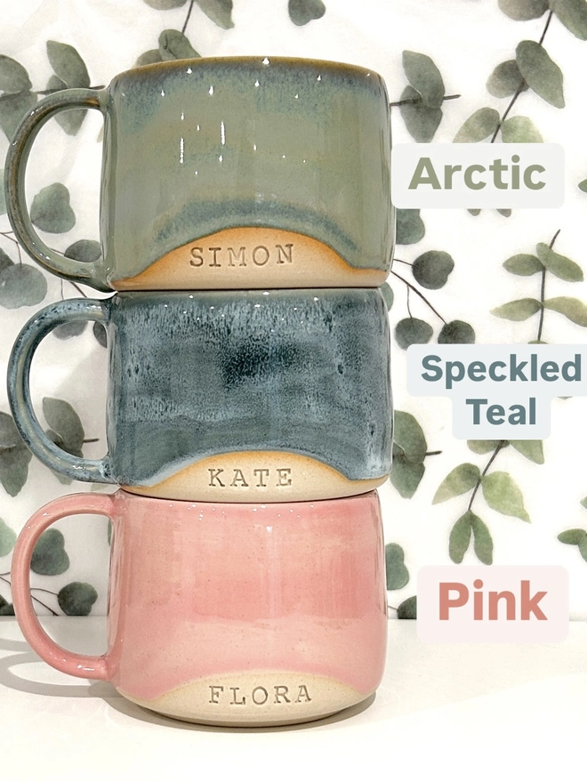 Personalisation includes text along the bottom edge of the mug but can also have text inside or on the base.