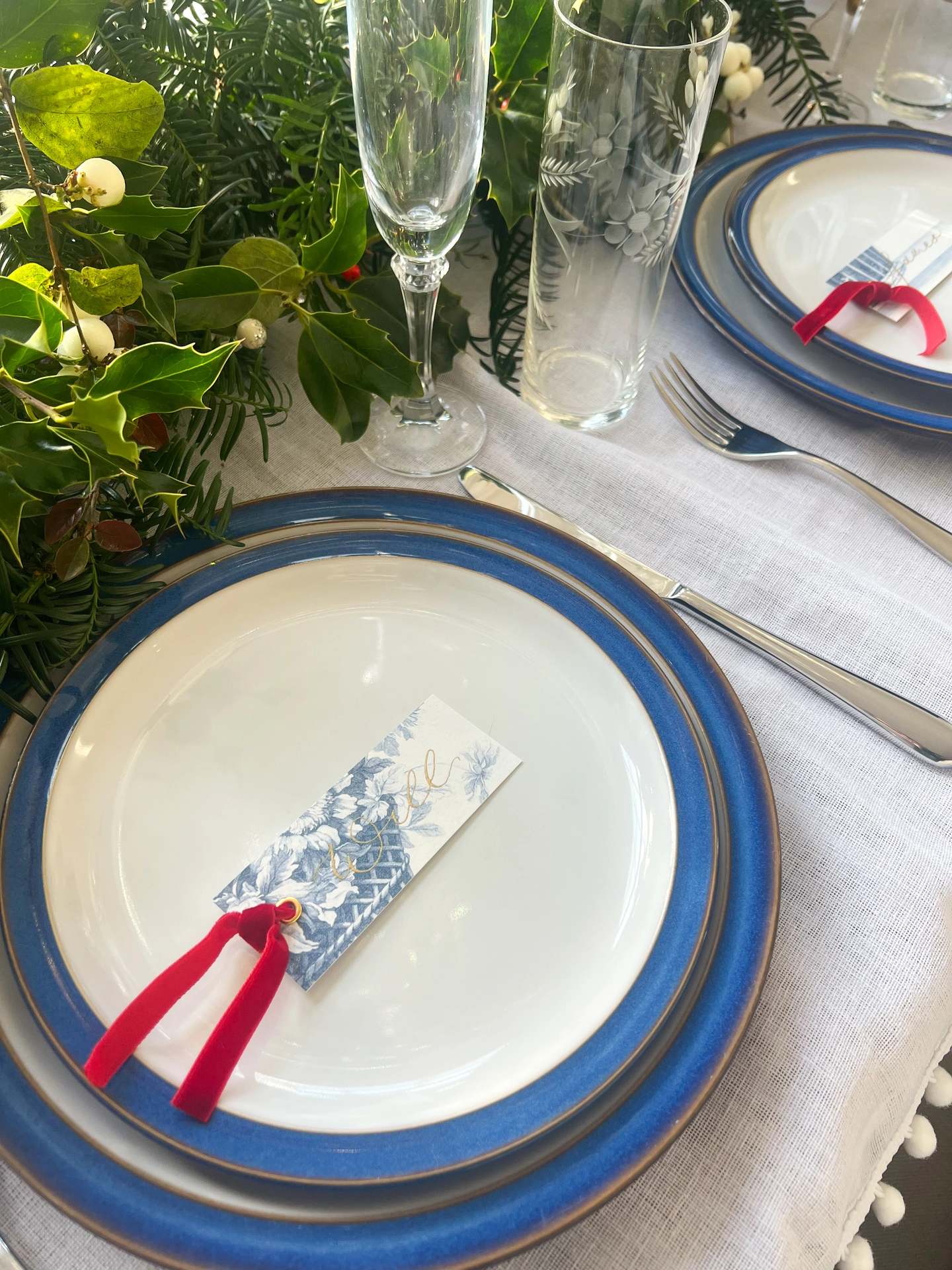 Chinoiserie style blue and white cards, with a lush red velvet ribbon, these place cards are fun and sophisticated and sure to be a talking point at your Christmas or event table.